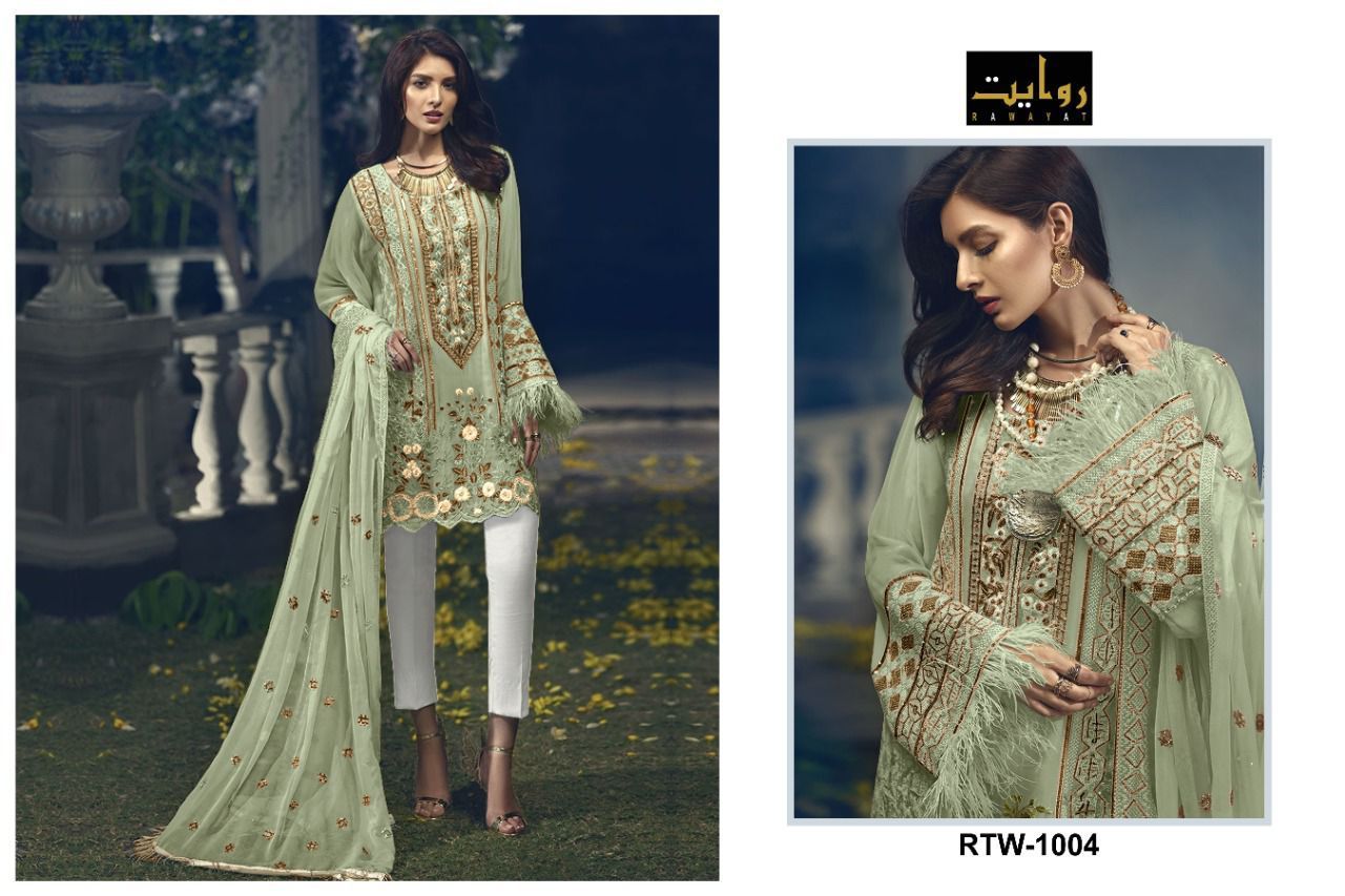 | DETAILS | *FABRICS* *RTW 1002/1003/1004/1005* TOP:-FOX GEORJOTT WITH EMBROIDERY AND HAND WORKBOTTOM:- Pure rayon lycra with embroideryDUPPATA:-Nazmin chiffon with HEAVY EMBROIDERY *SIZE :- Xxl*only Single design 4 color* |