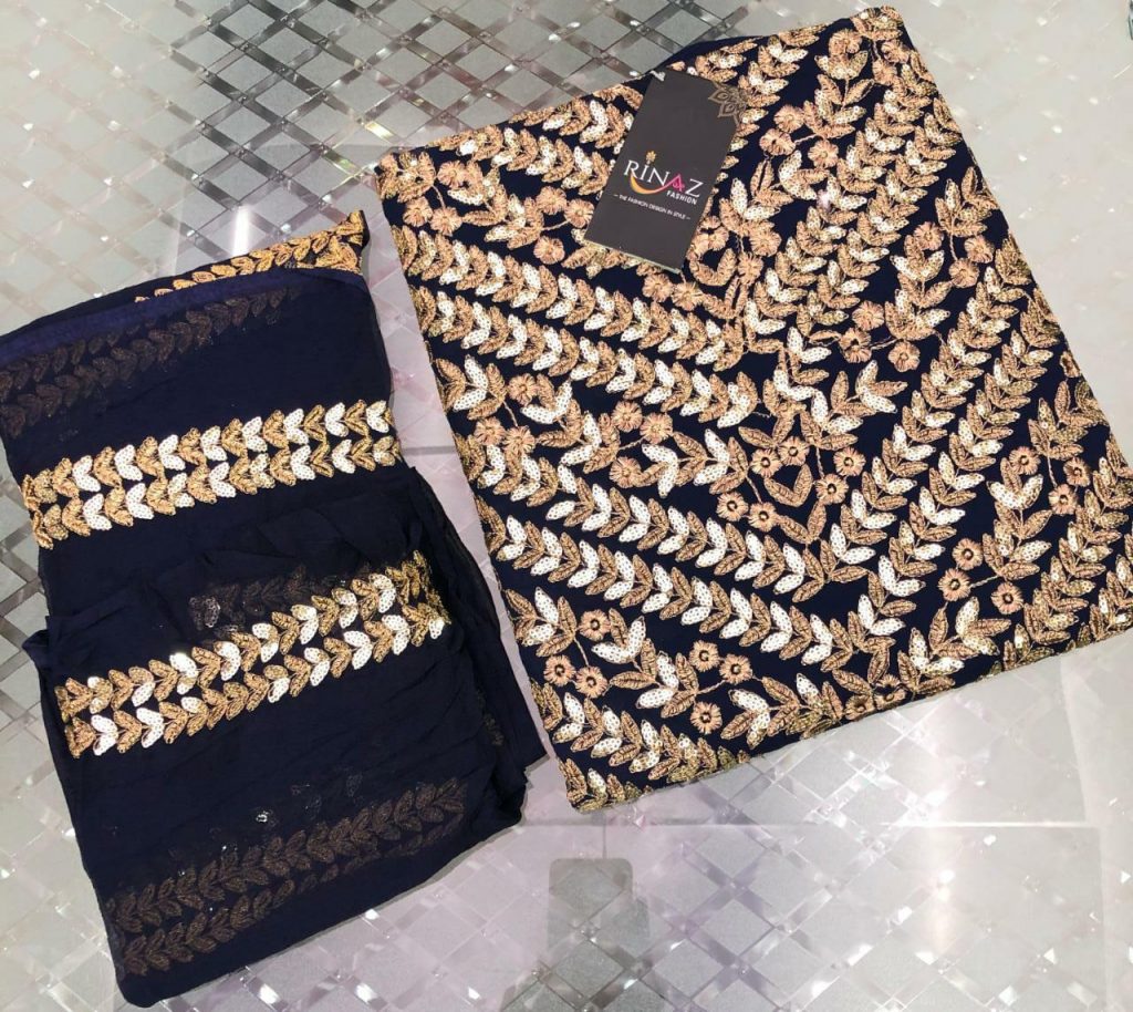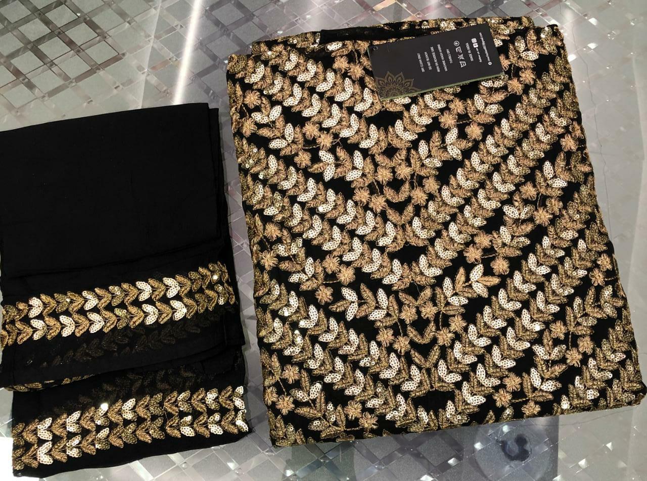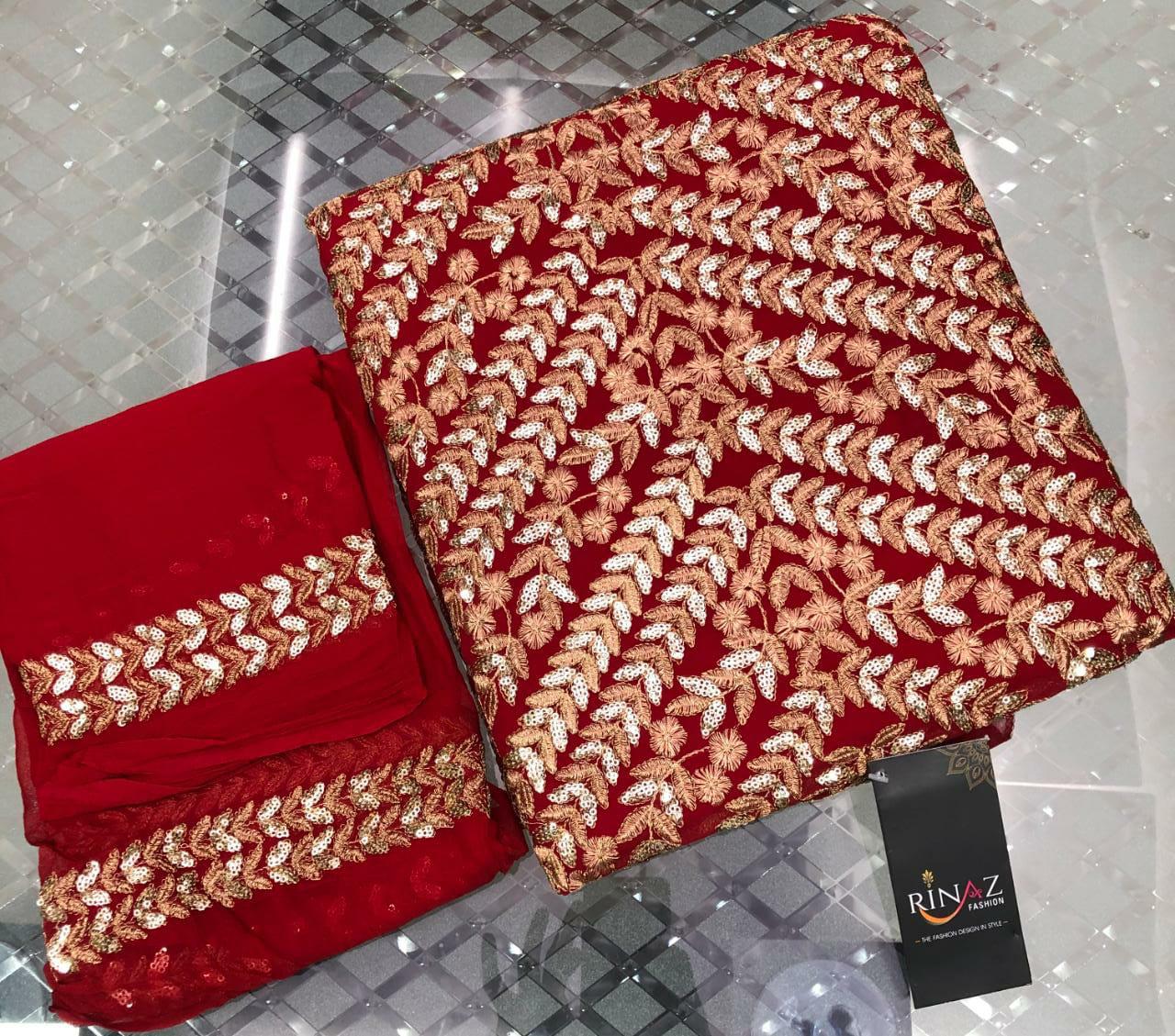 | DETAILS | TOP – *Pure Georgette* with beautiful Heavy *sequence* and heavy *embroidery* work all over ?INNER & BOTTOM – *Santon* ?DUPATTA – *Chiffon* with beautiful Both side double border *embroidery* work
