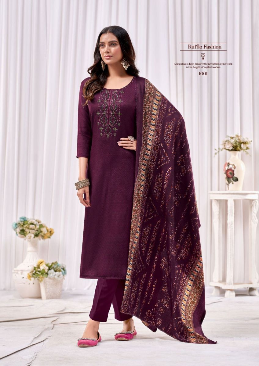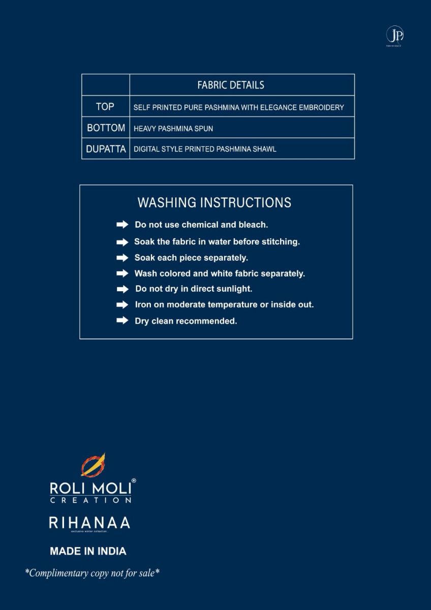 | DETAILS | *Fabric : Top - Pure Pashmina Self Print with Elegance Embroidery Work Cut -2.50 mtr ApproxBottom - Heavy Spun Cut - 2.60 MtsDupatta - Twill Printed Shawl Cut 2.25 Mts approx |