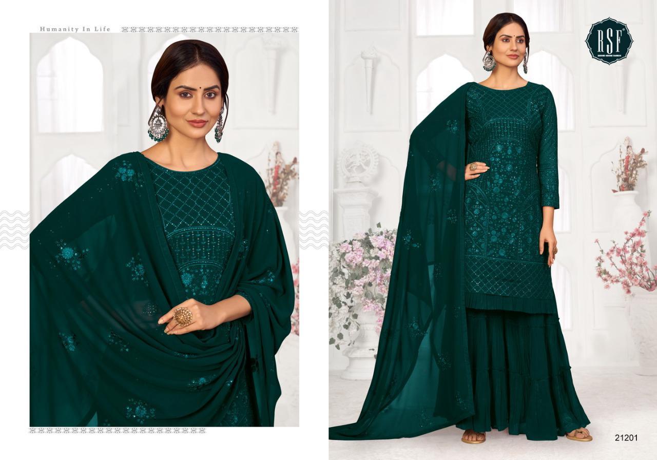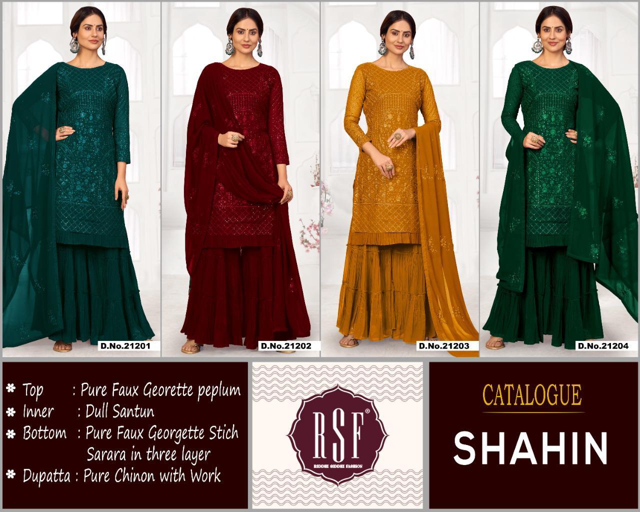 | DETAILS | **1-TOP:-Pure faux Gorgette With heavy multi Sequence embro with santun inner with freesize fullstich* *2-Bottom:-Faux Gorgette stich free size sarara* *3-Dupatta:-Pure Chinon with heavy embro work with fourside lace work * *4-Design:-4 Pcs * |