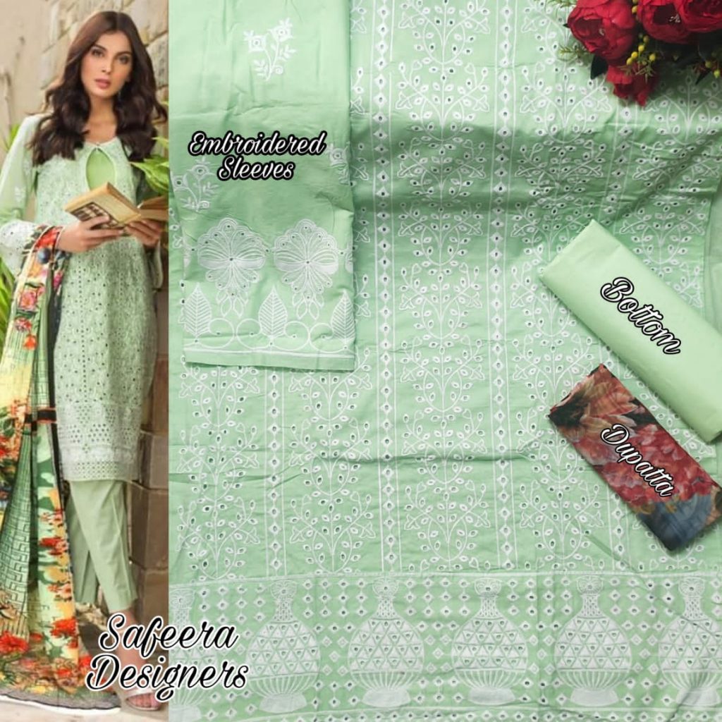 | DETAILS | *Top*:-Pure cotton Fabric with chikenkari work ✨ *Bottom* :- semi Cotton (3.0mtr approx) *Duptta*:- Digital printed chiffon |