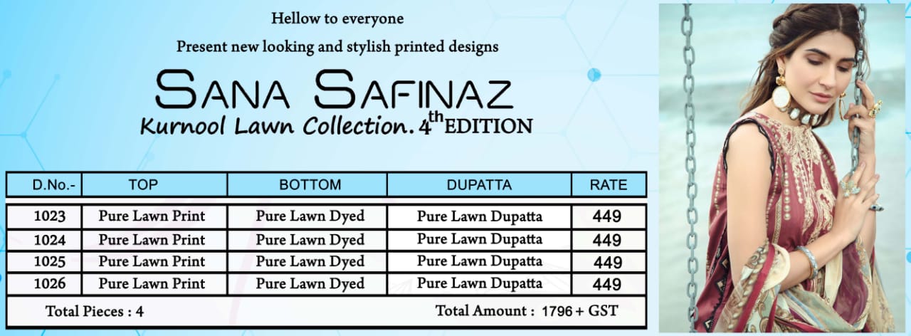 | DETAILS | SANA SAFINAZ KURNOOL* ? *PURE LAWN 2.40 MTR* *? PURE LAWN 2 MTR* *?DUPATTA PURE COTTON MAL MAL 2.25 MTR*
