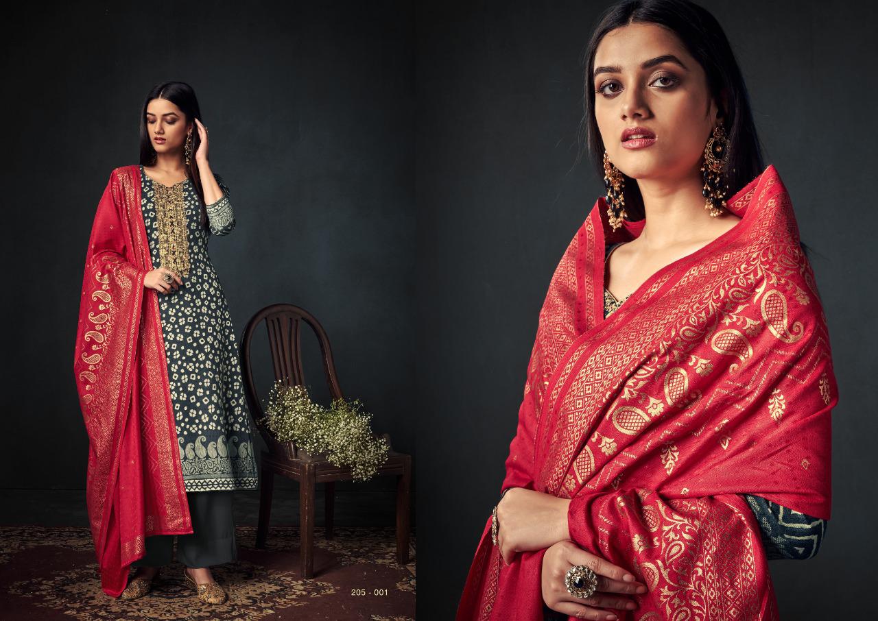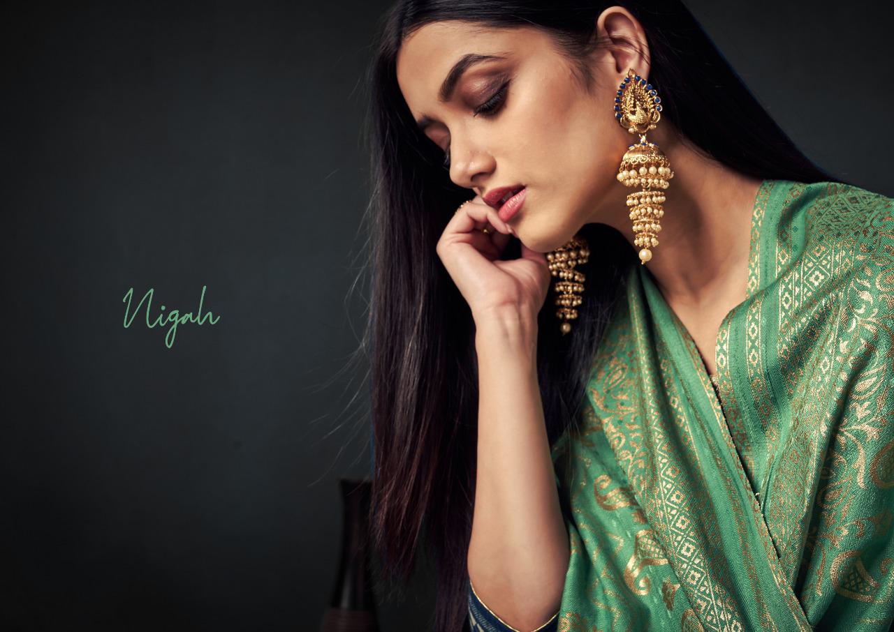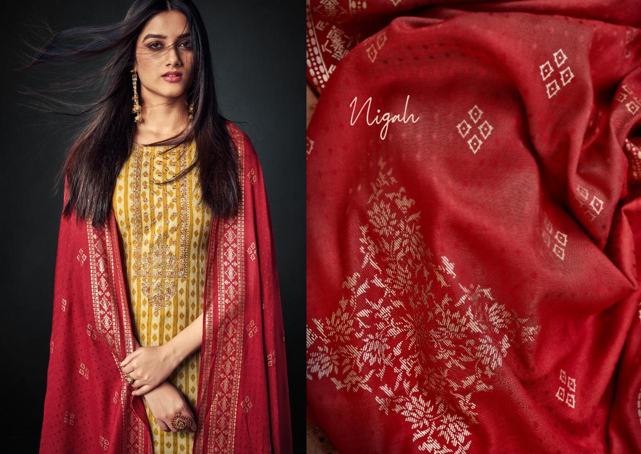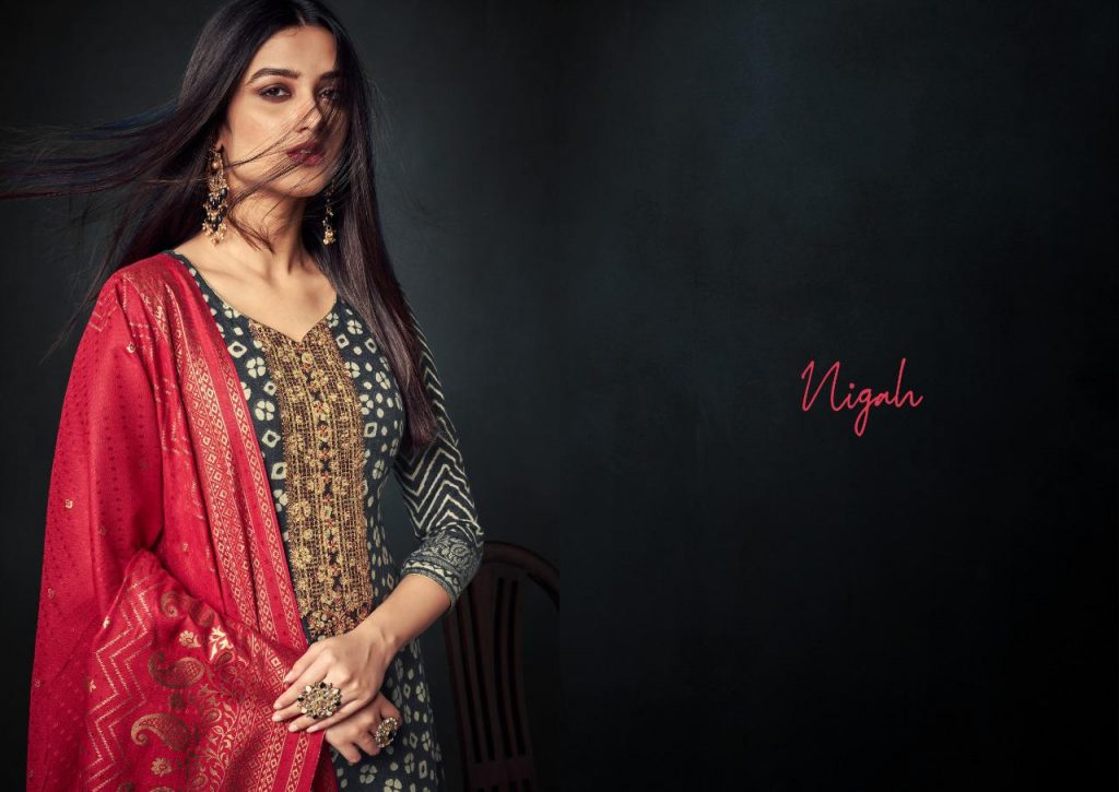 | DETAILS | SARGAM PRINTS Presents ***NIGAH*** *?Fabric Details?* *Top:* PURE PASHMINA DESIGNER PRINTS WITH EMBRODIERY WORK Bottom :*PURE WOOL DYED Dupatta:* PURE WOOLEN PRINTED SHAWL WITH FOIL *Designs:* 6 PCS *Rate:* ₹725 *HSN CODE:* 5407 |