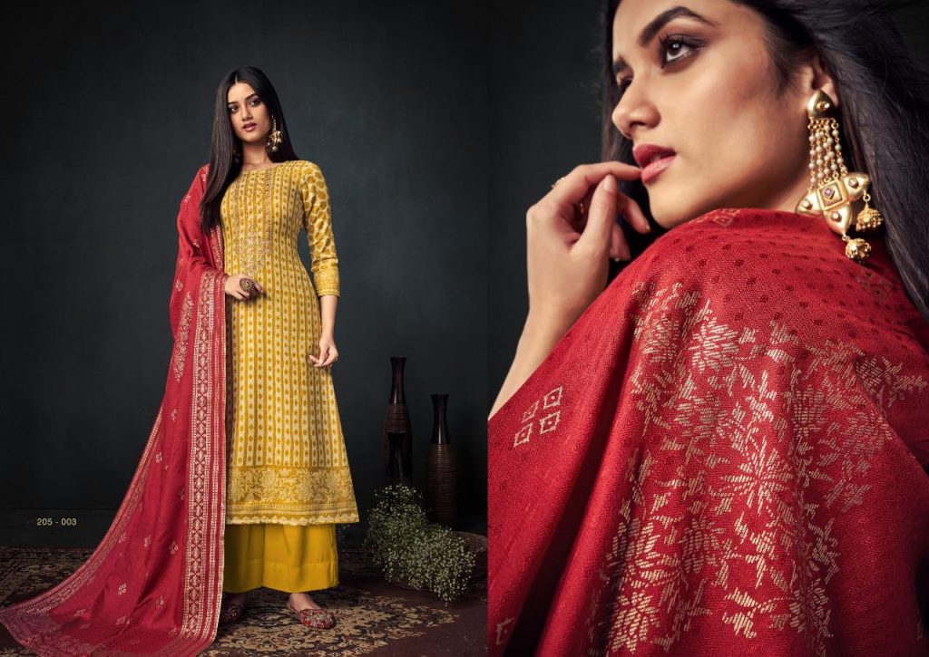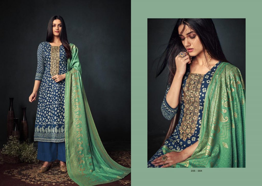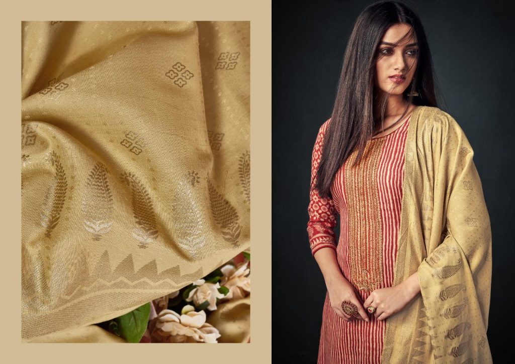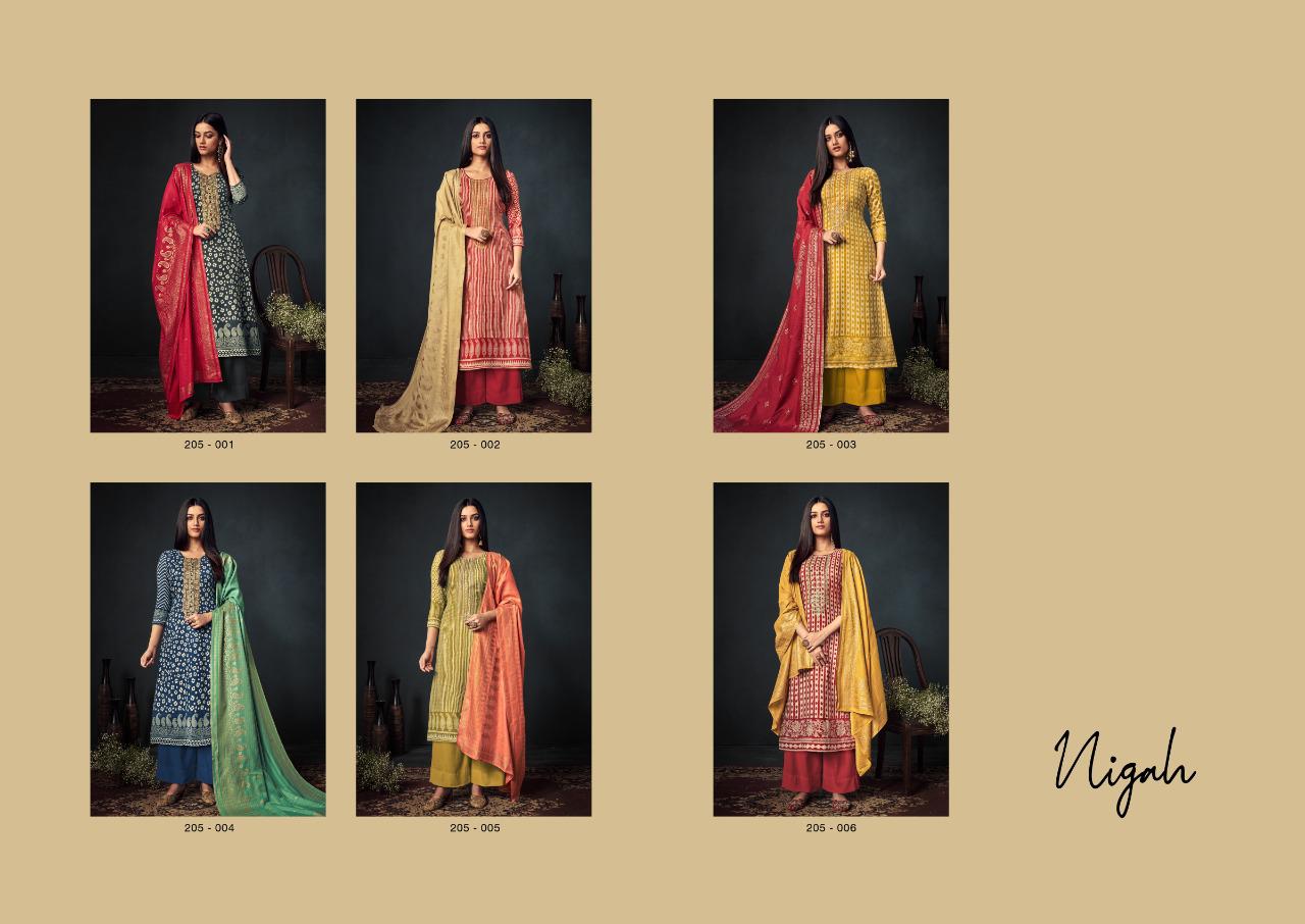 | DETAILS | SARGAM PRINTS Presents ***NIGAH*** *?Fabric Details?* *Top:* PURE PASHMINA DESIGNER PRINTS WITH EMBRODIERY WORK Bottom :*PURE WOOL DYED Dupatta:* PURE WOOLEN PRINTED SHAWL WITH FOIL *Designs:* 6 PCS *Rate:* ₹725 *HSN CODE:* 5407 |