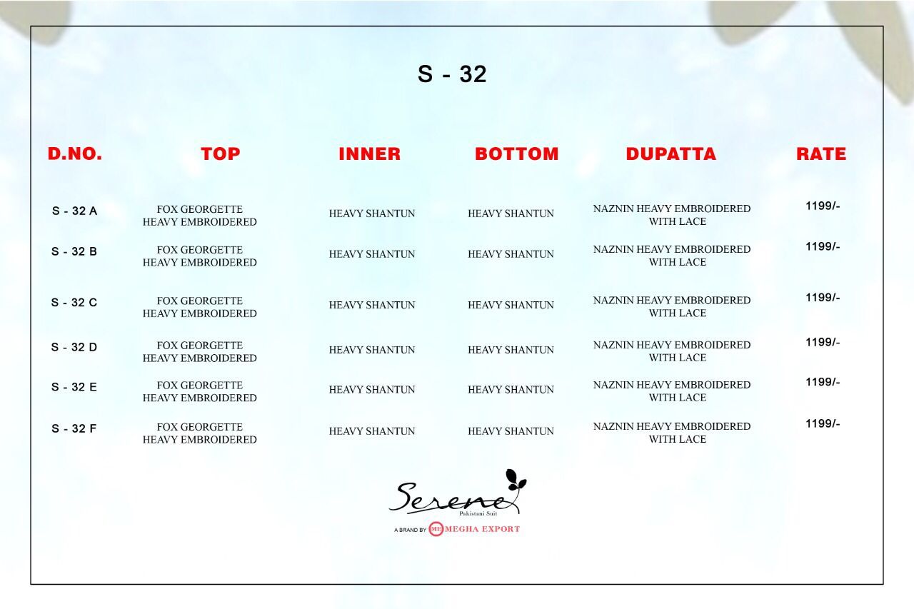 | DETAILS | *Fabric Details:*__*Top : Fox Georgette heavy embroidered *_*Inner Bottom - Heavy santoon **__*Dupatta : Nazneen heavy embroidered with lace*__* 6 Pcs in set*_ |