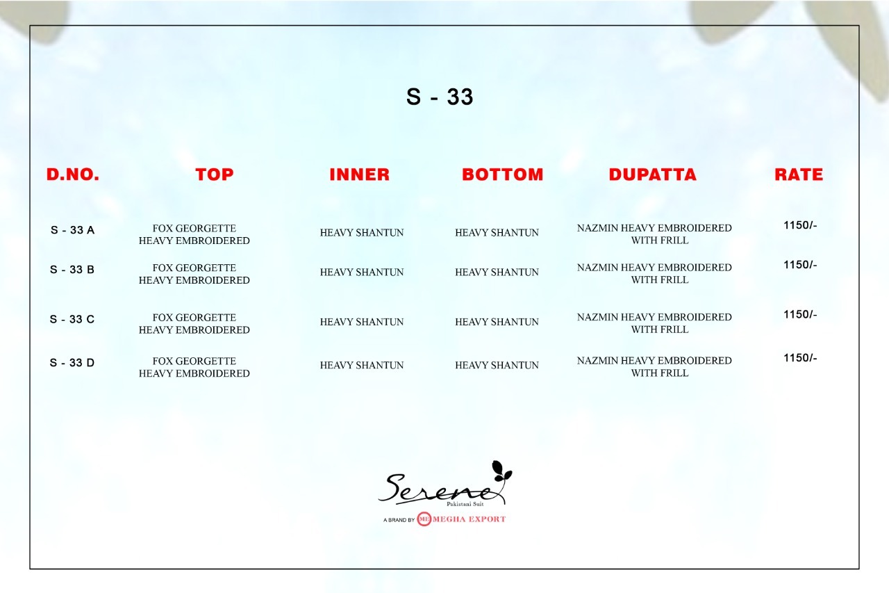 | DETAILS | *_*Fabric Details:*__*Top : Fox Georgette heavy embroidered*_*Inner Bottom - Heavy santoon **__*Dupatta : Nazneen heavy embroidered with Frill*__* 4 Pcs in set*_ |