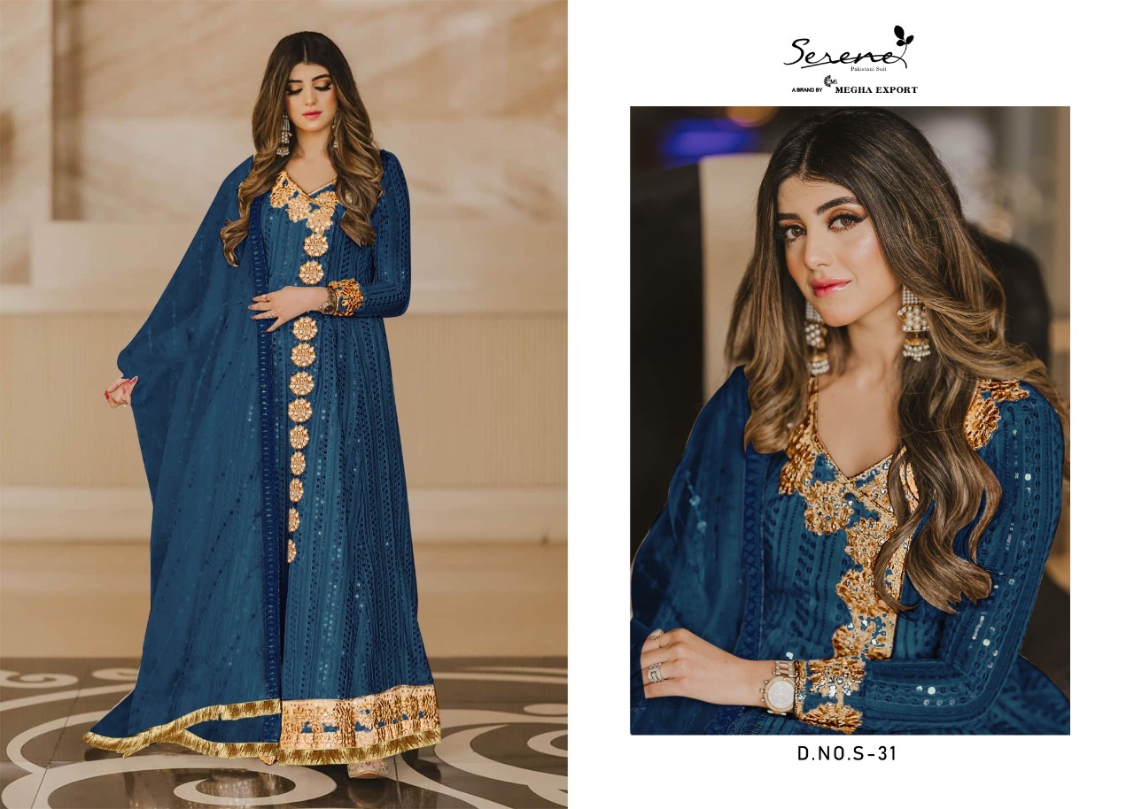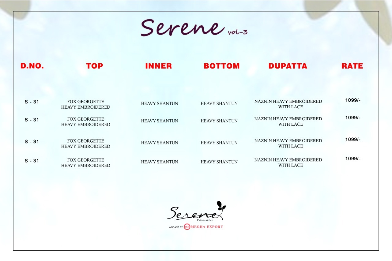 | DETAILS | **Fabric Details:*_ _*Top : Fox Georgette heavy embroidered *__*Inner Bottom - Heavy santoon *__*Dupatta : Nazneen heavy embroidered with lace*__* 4 Pcs in set*_ |