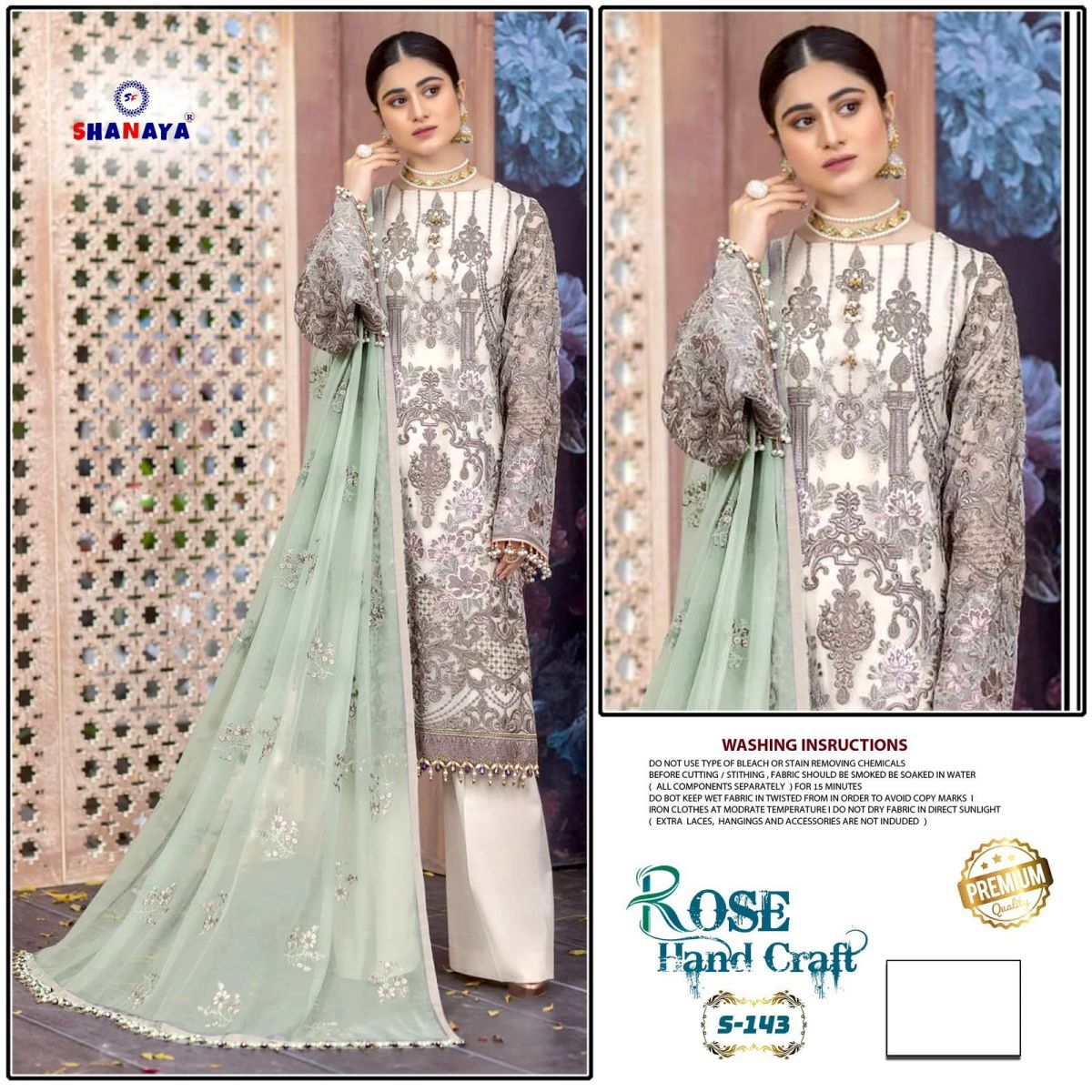 FABRIC DETAILS :- Top :- FOX GEORGETTE EMBROIDERY SEQUENCE WORK & ADDITIONAL *HAND KHATALI HANDWORK *Dupatta :- NAZMEEN HEAVY EMBROIDERED WORKBottom :- DULL SANTOONINNER :- DULL SANTOONSHANAYA FASHION S 143 ROSE HAND CRAFT SUITS