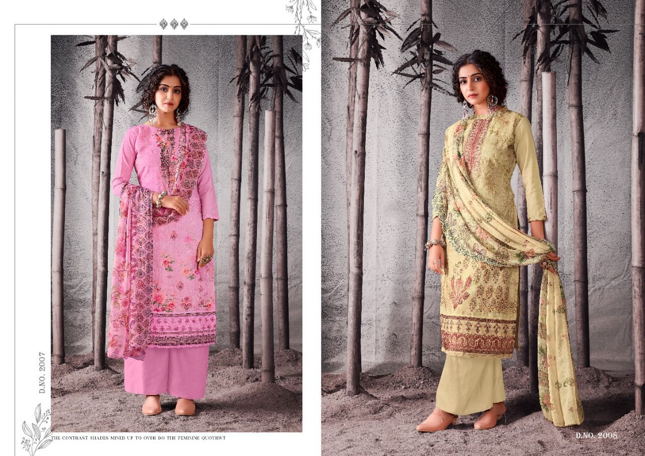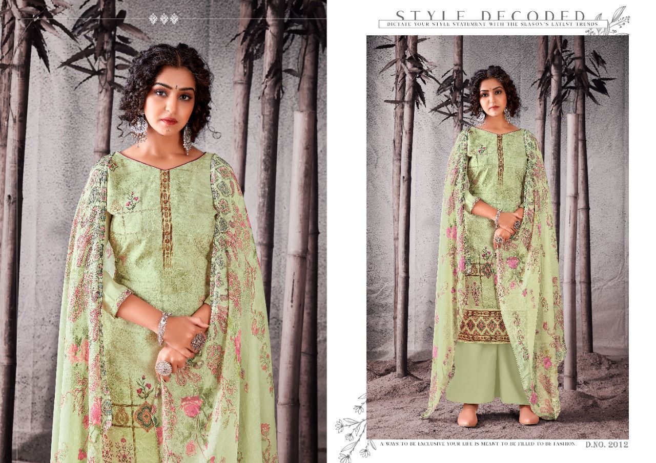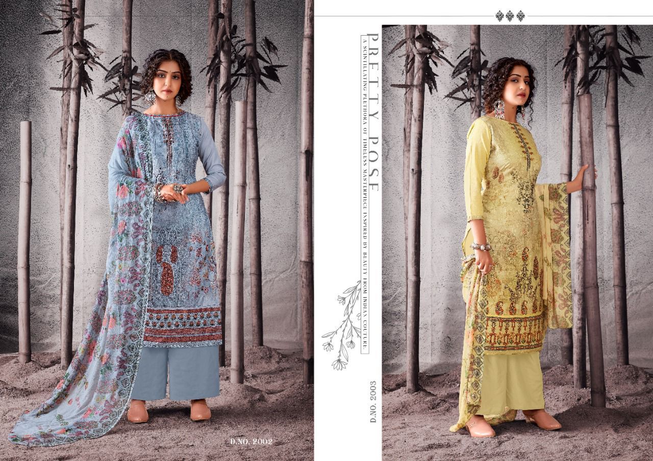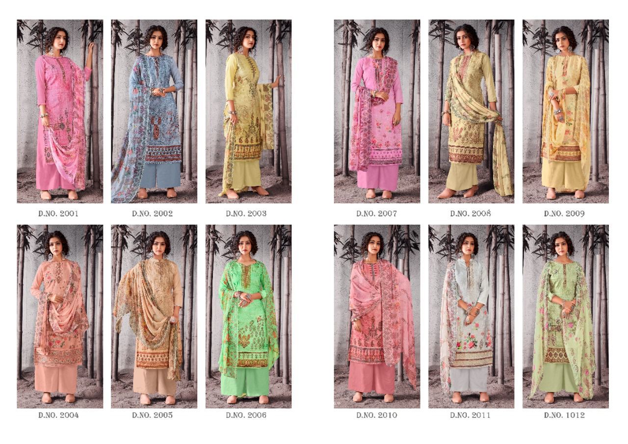 | DETAILS | Top: full heavy digital print with full jal work on front, with digital lace full length 47”inch with back plain ! 2.50 mtrs top.Dupatta: Exquisitely Printed nazneen with (2.25 mtrs)Bottom: Heavy indonacia cotton 2.50 mtrsBeautiful 12 design set |