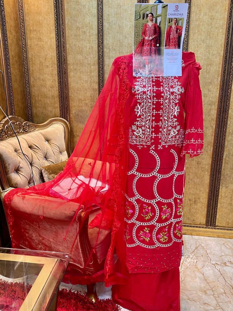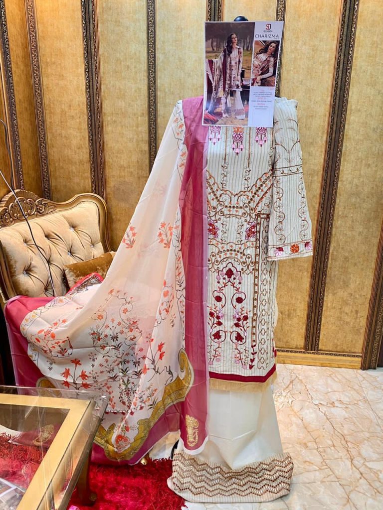 | DETAILS | ? Top : Pure cambric cotton with chicken work and heavy embroidery ?Bottom :Semi lawn with embroidery ?Dupatta : Tabby Silk digital print / heavy butterfully net with work |
