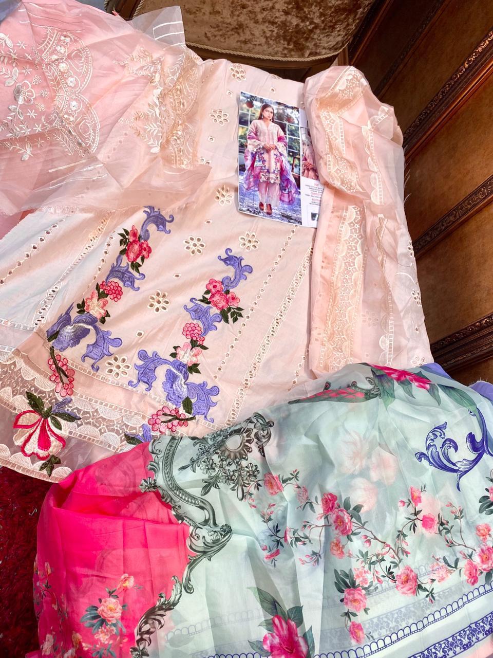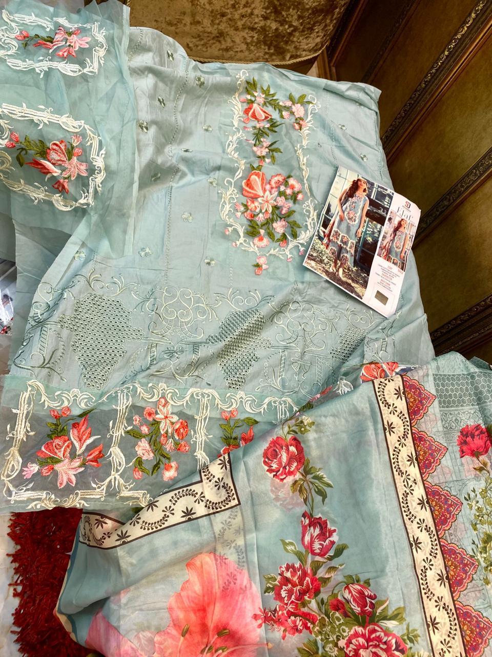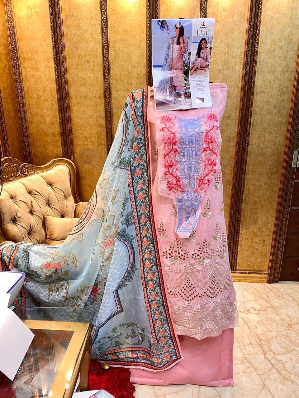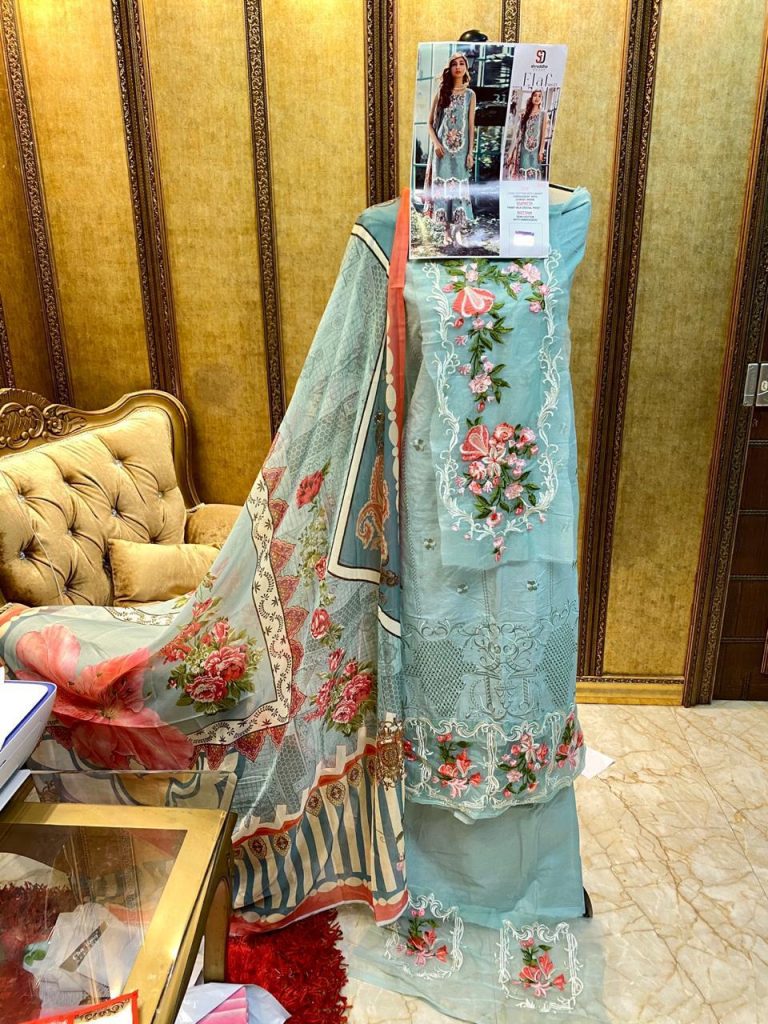 | DETAILS | *SD-ELAF NX* ??Fabric details ?? ? Top : Pure cambric cotton with chicken work and heavy embroidery ?Bottom :Semi lawn with embroidery ?Dupatta : Tabby Silk digital print ?Price : ? 1015/-+ *GST* ❤ 3pc |