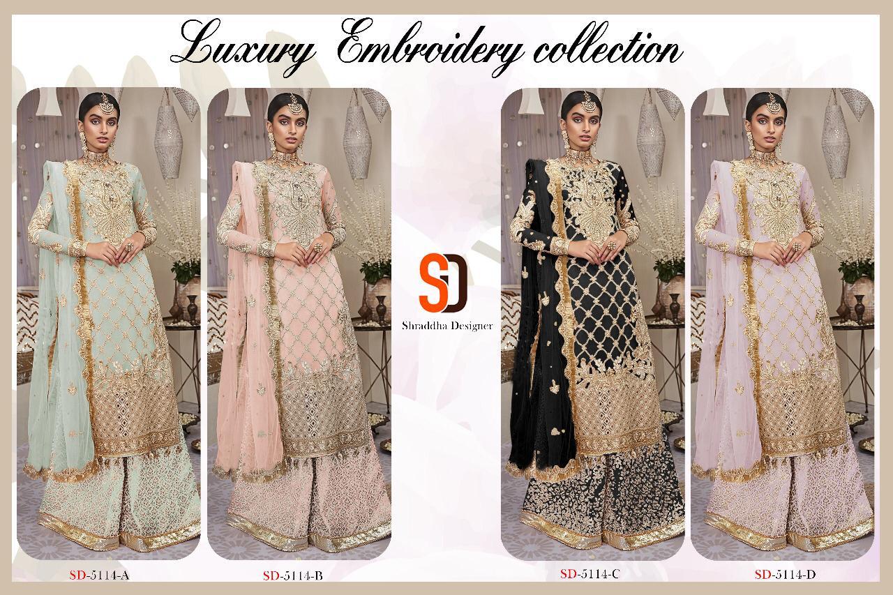 | DETAILS | SHRADDHA DESIGNER Presents our New Single Design *SUPER HIT BRIDAL COLOUES COLLECTION* Name – **SD-5114* Fabric details – Bottam:- Foil Printed Santoon Dup – Heavy Butterfly Net with Hevy Embroidery Less Pcs: *4* Rate – *1099* |