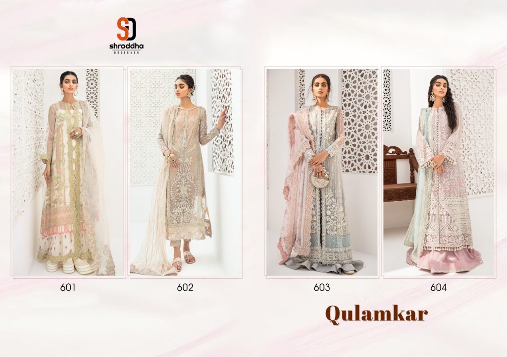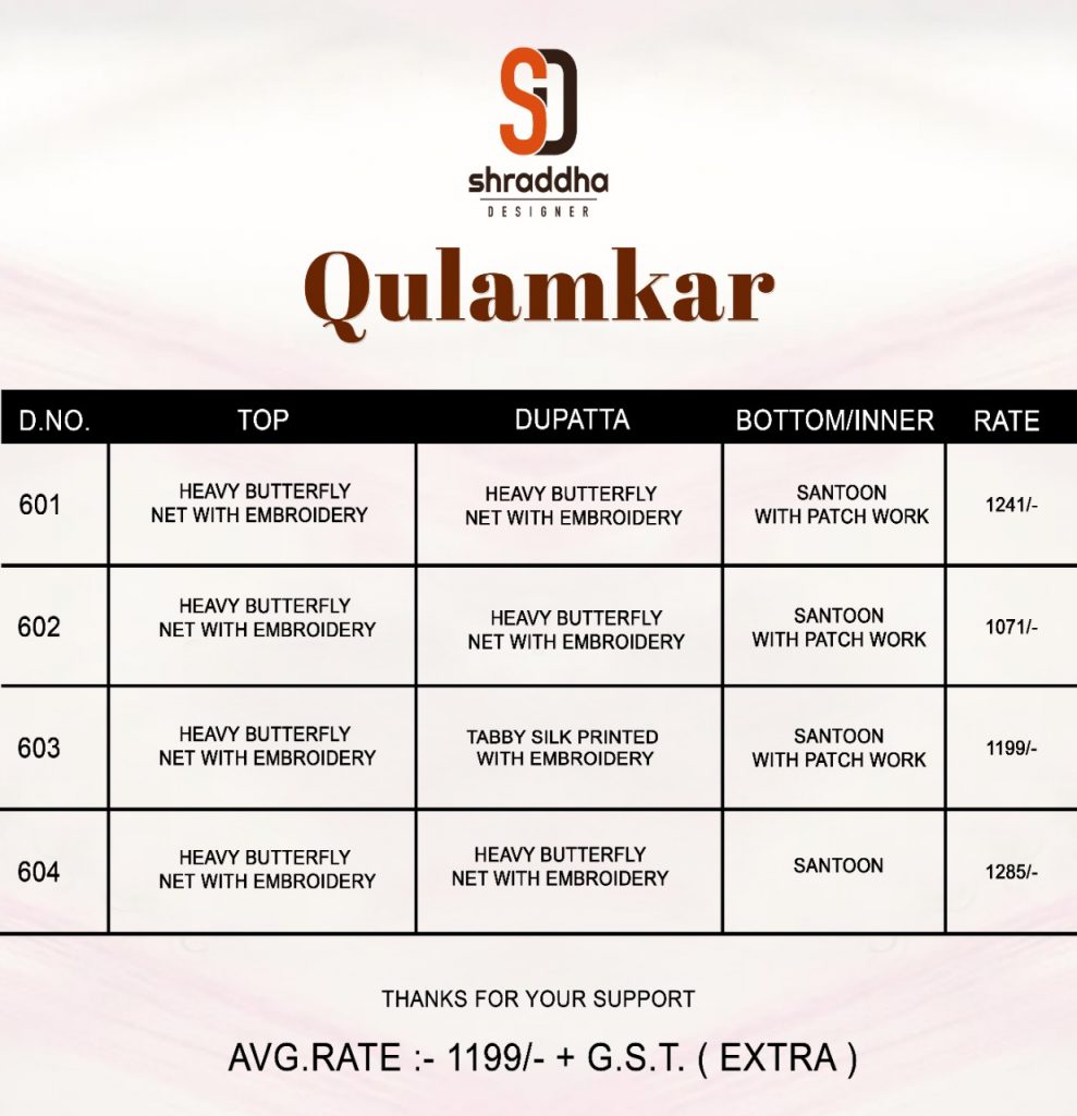 | DETAILS | SHRADDHA DESIGNER Presents our new Catlog *Qulamkar* *SUPER HIT BRIDAL COLLECTION* Name – **QULAMKAR*** Fabric details – Bottam:- Santoon/ work Dup – Heavy Butterfly Net with Hevy Embroidery Less Pcs: * 4 * Rate – *1199+Gst* |
