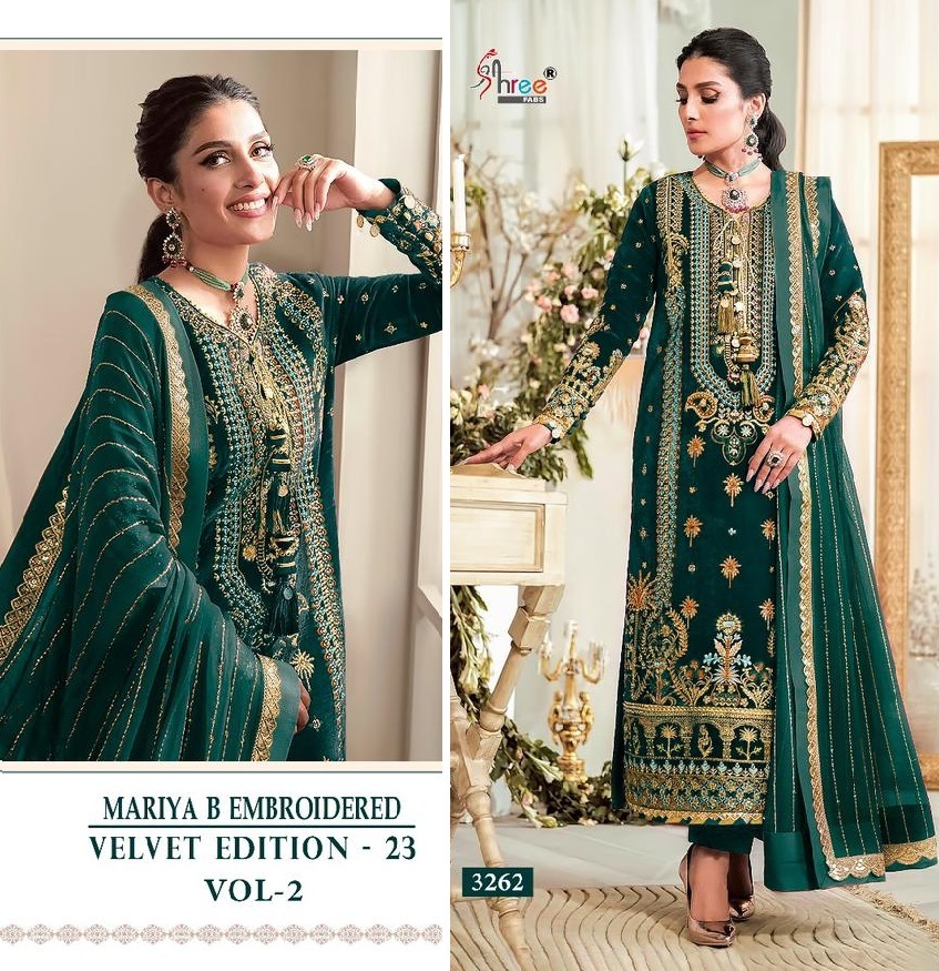 FABRIC DETAILS :- TOP PURE 9000 velvet heavy embroideredBottom pashminaDupatta embroidered chinnon ( 1 des velvet )SHREE FABS 3262 MARIYA B EMBROIDERED VELVET VOL 2 SUITS