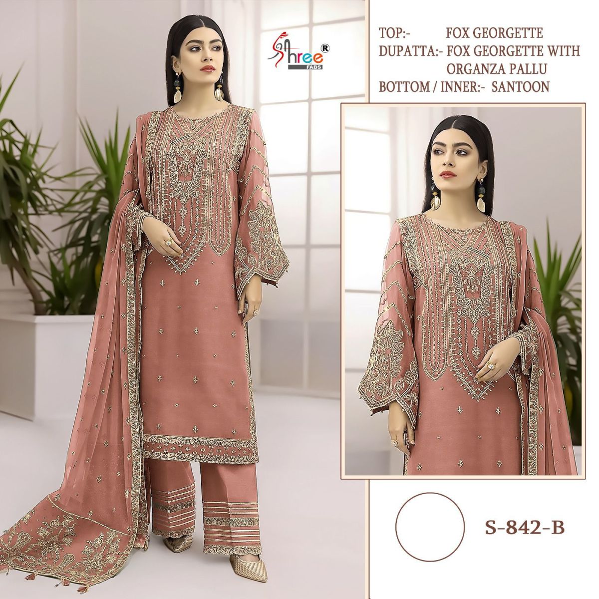 FABRIC DETAILS :- Top: fox jeorgett with heavy embroideryBottom: dull Santoon(inner)Dupatta *: fox jeorgett with embroiderySHREE FABS S 842 SERIES SALWAR WHOLESALE