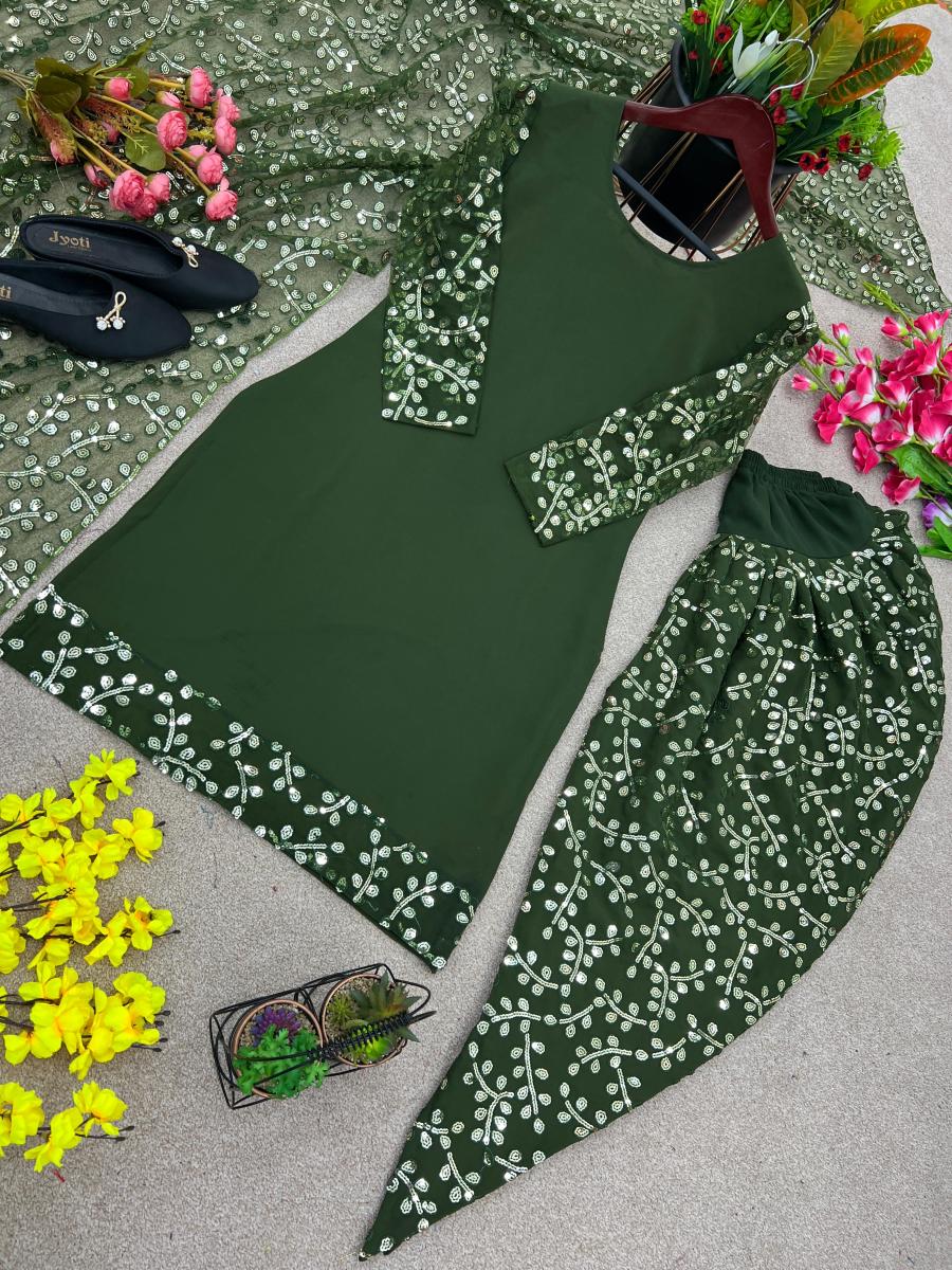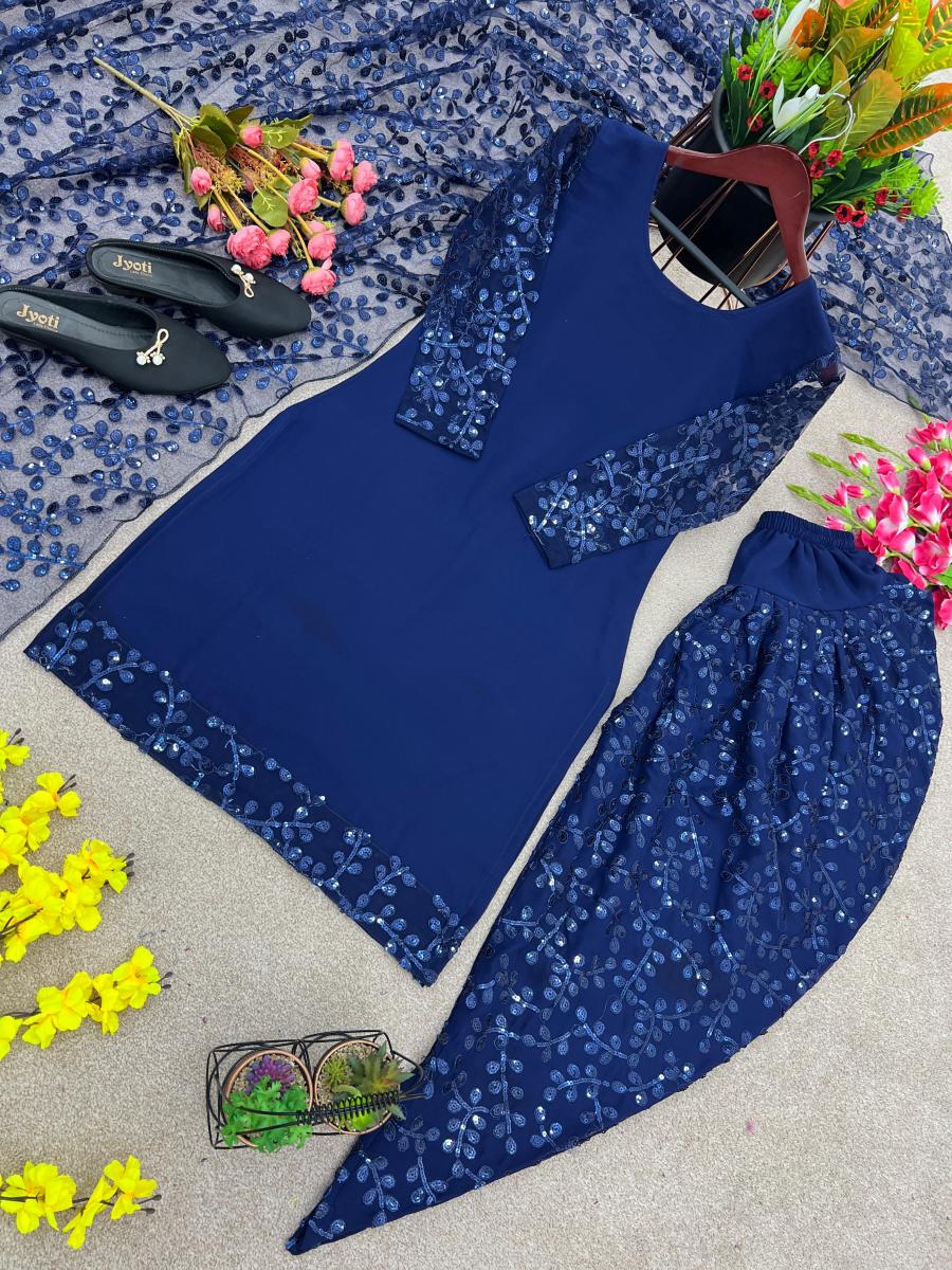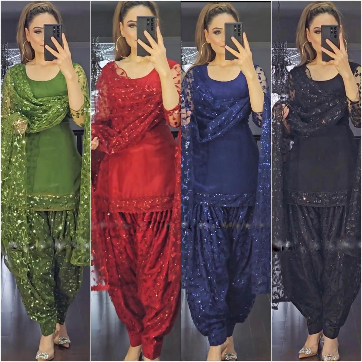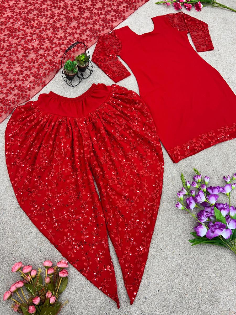 FABRIC DETAILS :- *Top Fabric * :Faux Georgette With Heavy *Embroidery 5mm Sequence Work With Sleeve**Too Inner* : Micro Cotton *Top Size* :* *M(38),L(40),XL(42),XXL(44)* *(Fully Stitched)* *Top Length* : 38 Inches*Dhoti Salwar* :*Faux Georgette With Embroidery 5 mm Sequence Work* *(Fully Stiched Dhoti Styles Xl size and Length is 44-45)* *Dhoti Inner* :Micro Cotton*Dupatta Fabric* : Heavy Net With Embroidery Sequence Work *Dupatta Length:* 2.10mtr *Package Contain* :- Top, Dhoti Salwar and DupattaSHREE HARI NSR 672 DESIGNER GOWN WHOLESALE