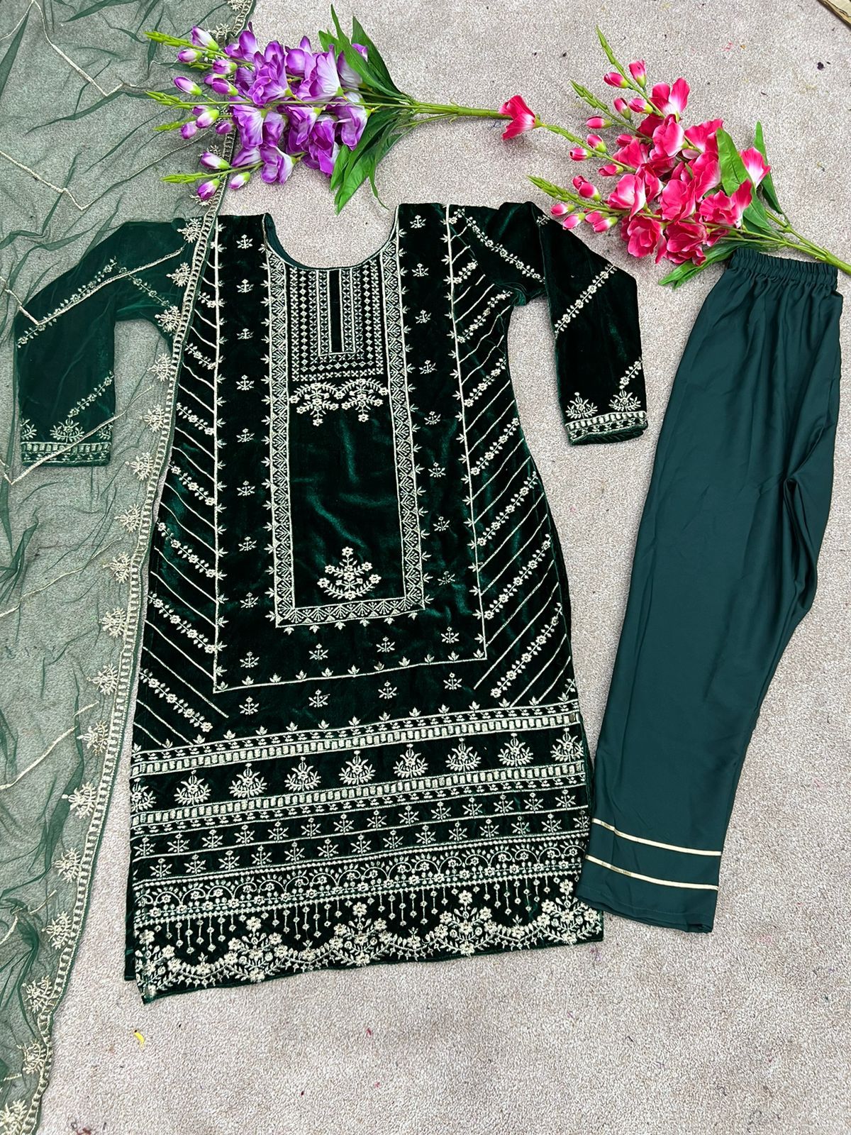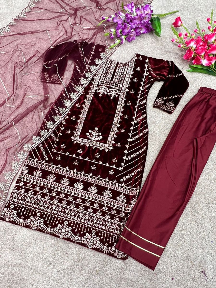 FABRIC DETAILS :- Top Fabric :Heavy Viscose Velvet With Heavy Embroidery Work With SleevesTop Inner : Micro Cotton Top Size : M(38),L(40),XL(42), XXL(44) (Fully Stitched Completely Ready To Wear) Top Length : 40-41 InchesBottom Fabric : Micro cotton ( Full Stiched)Dupatta Fabric : Heavy Net with Embroidery Work With Heavy Embroidery lace border WHATSAPP BROADCAST LIST SEND YOUR NAME AND CITY ON+91-8799402355