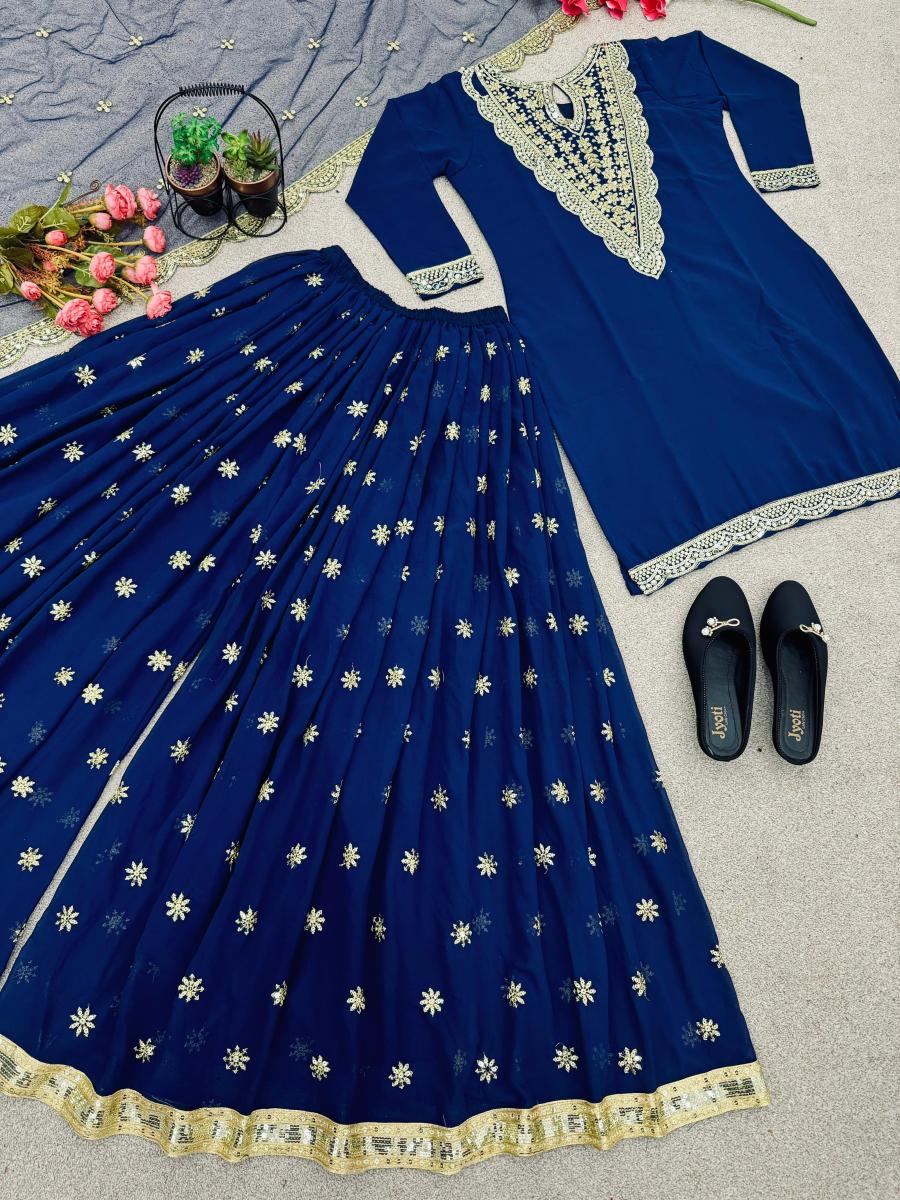| FABRIC DETAILS | Top Top Fabric :Heavy Faux Georgette With Heavy Embroidery Sequence Work With Real Mirror Handwork With Full Sleeve Top Inner :Heavy Micro Cotton *Top Length * : 37-38 Inch Top Size :* M(38),L(40),XL(42),XXL(44) (Fully Stitched) (FULLY STITCHED READY TO WEAR) Plazo Plazzo Fabrics :Heavy Faux Georgette With Embrodary 5mm Siquance Work Plazzo inner :Heavy Micro Cotton (Full stitched)Plazzo Length:40-41 Inch (fully stitched) Dupatta *Dupatta Fabric * :Soft Butterfly Net With Embroidery Sequence Work Four Side Less Border |