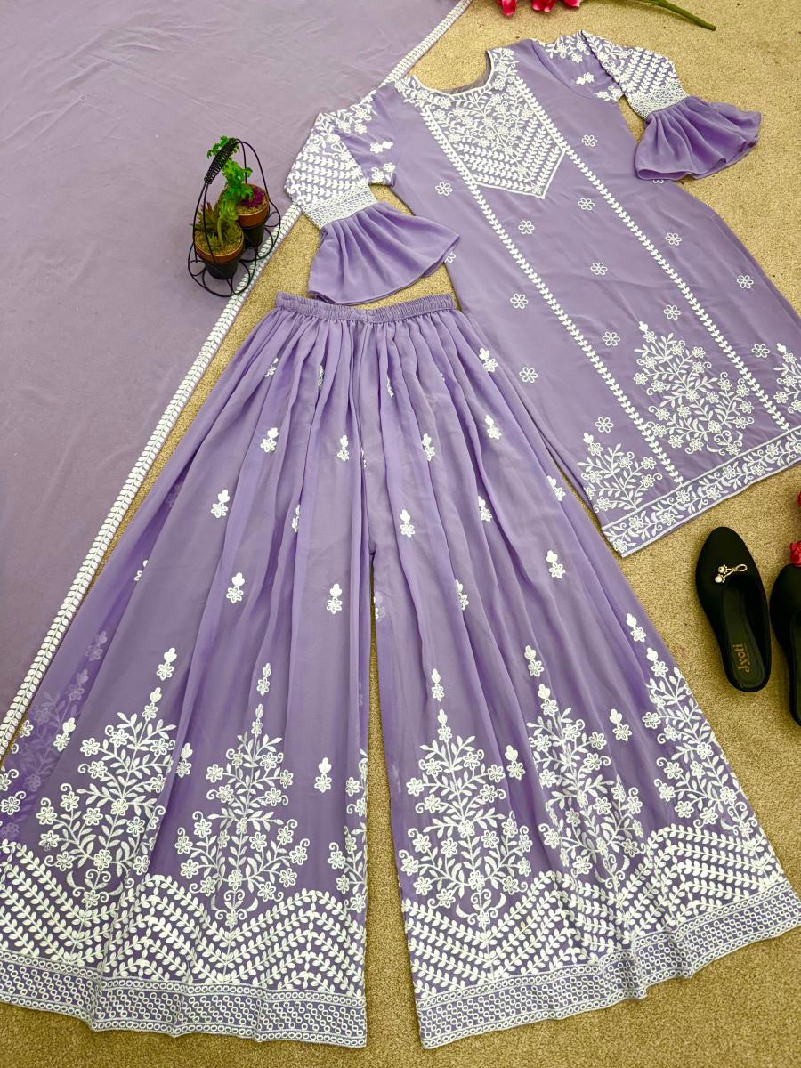 | FABRIC DETAILS | Top Top Fabric : Faux Georgette With Heavy Embroidery Thread Work (Full stitched)Top Inner :Heavy Micro Cotton Top Length :38-38 inch Top Size :M(38),L(40),XL(42), XXL(44) (Fully Stitched Completely Ready To Wear)Sharara Plazo Plazo Fabric : Faux Georgette With Embrodary Thread Work (Fullstitched)Dupatta *Dupatta Fabrics * Faux Georgette With Embroidery Work With Less Border (Dupatta Size 2.20 meter) |