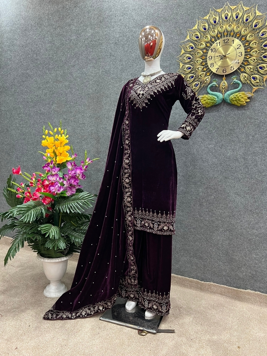 FABRIC DETAILS :- Top Fabric :Heavy Viscose Velvet With Heavy Embroidery Work With Moti handwork With Full SleevesTop Inner : Micro Cotton Top Size : Up To 42 XL With Xxl Marjin Free Size (Fully Stitched) Top Length * : 39-40 InchesBottom Fabric * : Viscose Velvet with EmbroideryWork with Moti handwork ( *Full Stiched *)Dupatta Fabric : Heavy Viscose Velvet With Rivet Moti Work and Embroidery Work lace borderWeight :- 1.2 kgVIEW PRODUCTS
