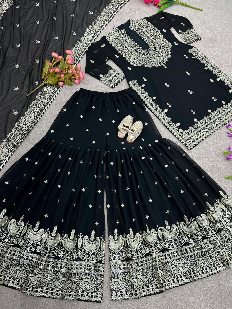 | FABRIC DETAILS | * Top * Top Fabric : Faux Georgette With Heavy 5mm Embroidery Work With Sleeves (Full stitched)Top Inner :Heavy Micro Cotton Top Length :36 Inch Top Size :M(38),L(40),XL(42), XXL(44) (Fully Stitched Completely Ready To Wear)Sharara Plazo Plazo Fabric : Faux Georgette With Heavy 5mm Embroidery Work With Fully Flair (Fullstitched)Dupatta *Dupatta Fabrics * Faux Georgette With Heavy 5mm Embroidery Work With 5mm Embroidery Lace Border (Dupatta Size 2.20 meter) |