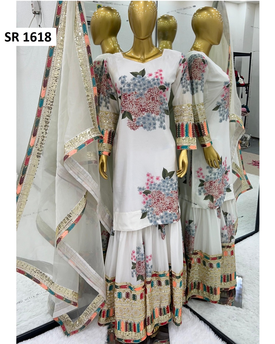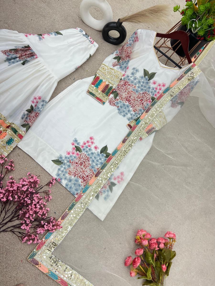 | FABRIC DETAILS | Top Top Fabric :Pure Heavy Chinnon Silk With Embroidery And 5mm Sequence Work With Full Sleeves Top Inner :Heavy Micro Cotton Top Length :40-41 Inch Top Size. : M(38)L(40)XL(42) And XXL(44) Fully Stitched Ready To Wear Sharara PlazoFabrics :Pure Heavy Chinnon Silk With 5mm Embroidery Sequence Work With Fully Flair Sharara inner :Heavy Micro CottonDupatta Dupatta Fabric :Pure Heavy Organza With Embroidery Work And Four Side Lace Border |