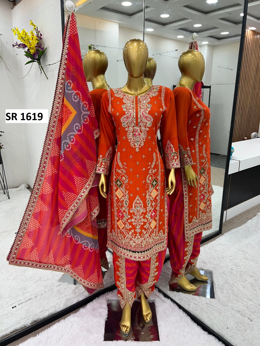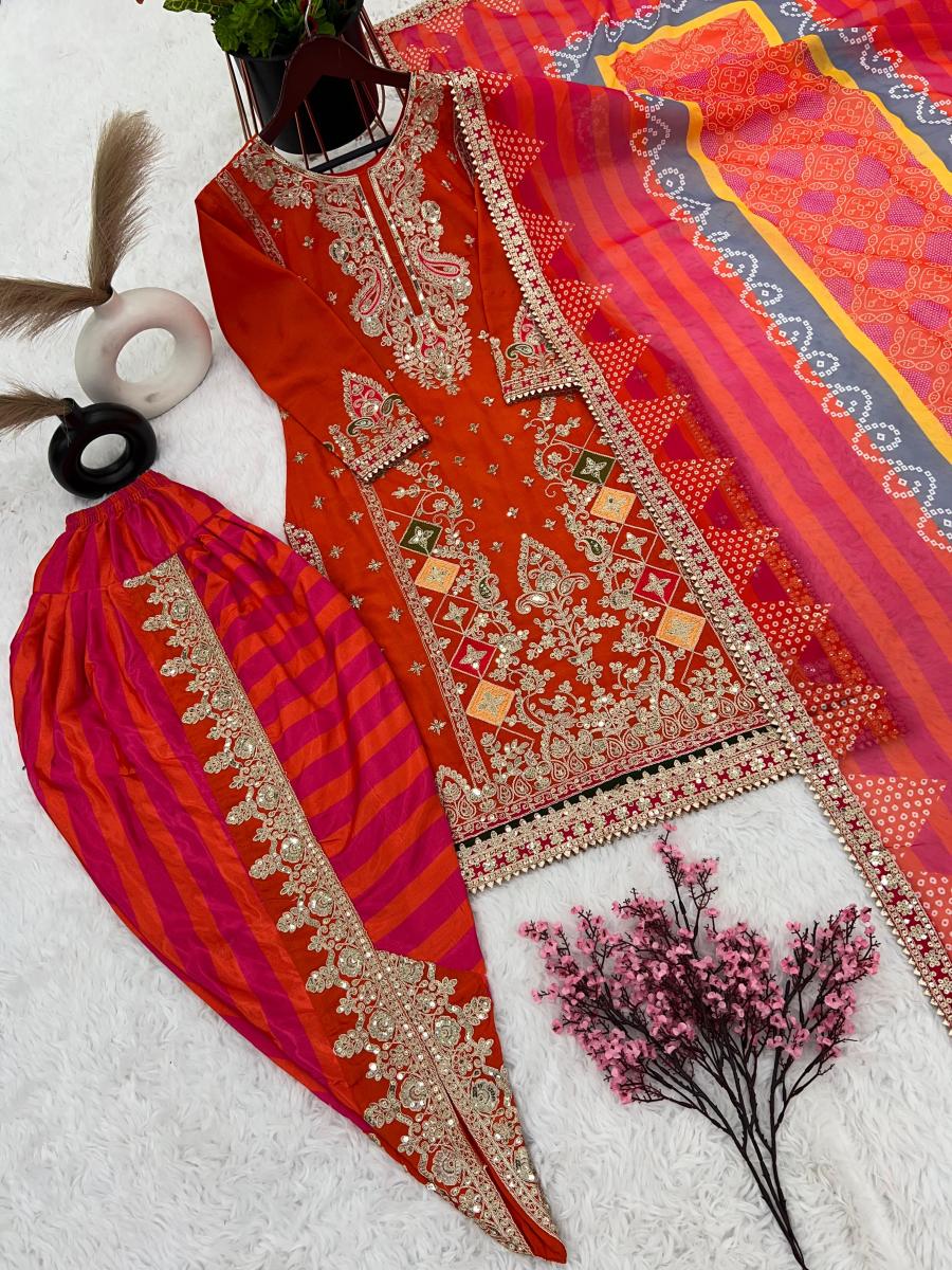 | FABRIC DETAILS | Top Fabric * :Heavy Chinon With *Embroidery Sequence with Coding Work With SleeveTop Inner : Micro Cotton Top Size : Up To 42 Xl Free Size With XXL Margin*(Fully Stiched)* Top Length : 42 InchesDhoti Salwar :Heavy Chinon With Digital Print Work With Embroidery Coding Work (Fully Stiched Dhoti Styles Xl size and Length is 41-42) Dhoti Inner :Micro CottonDupatta Fabric :Heavy Faux Georgette With Digital Print Work and Embroidery Sequence With coding Work With Lace Border Dupatta Length: 2.10mtr Package Contain :- Top, Dhoti Salwar and Dupatta |