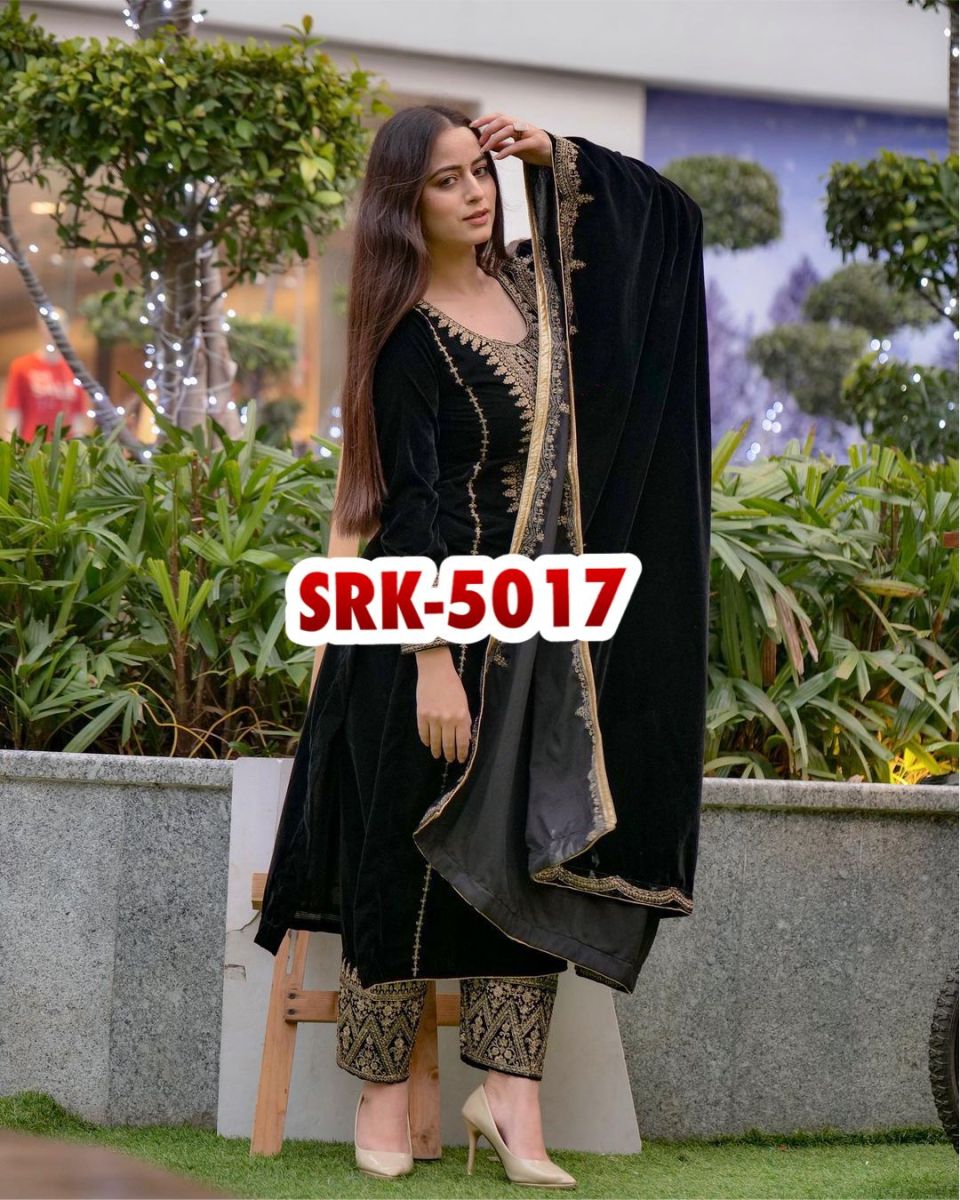 Top Length * : 39-40 InchesBottom Fabric * : Viscose Velvet with Embroidery Sequence Work ( *Full Stiched *)Dupatta Fabric : Viscose Velvet with Embroidery Sequence Work lace border SHREE HARI SRK 5017 DESIGNER VELVET SUITS