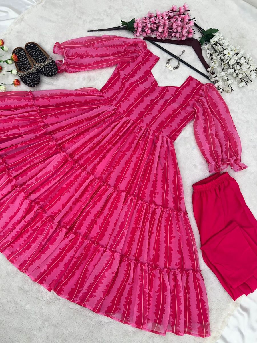 | FABRIC DETAILS | Frock Fabric :Faux Georgette With DigitalPrint With Fancy Sleeve and Fully FlairFrock Inner : Micro Cotton Frock Size : M(38),L(40),XL(42),XXL(44) (Fully Stitched Ready To Wear) Bottom Fabric * : Micro Cotton ( *Fully Stitched) |