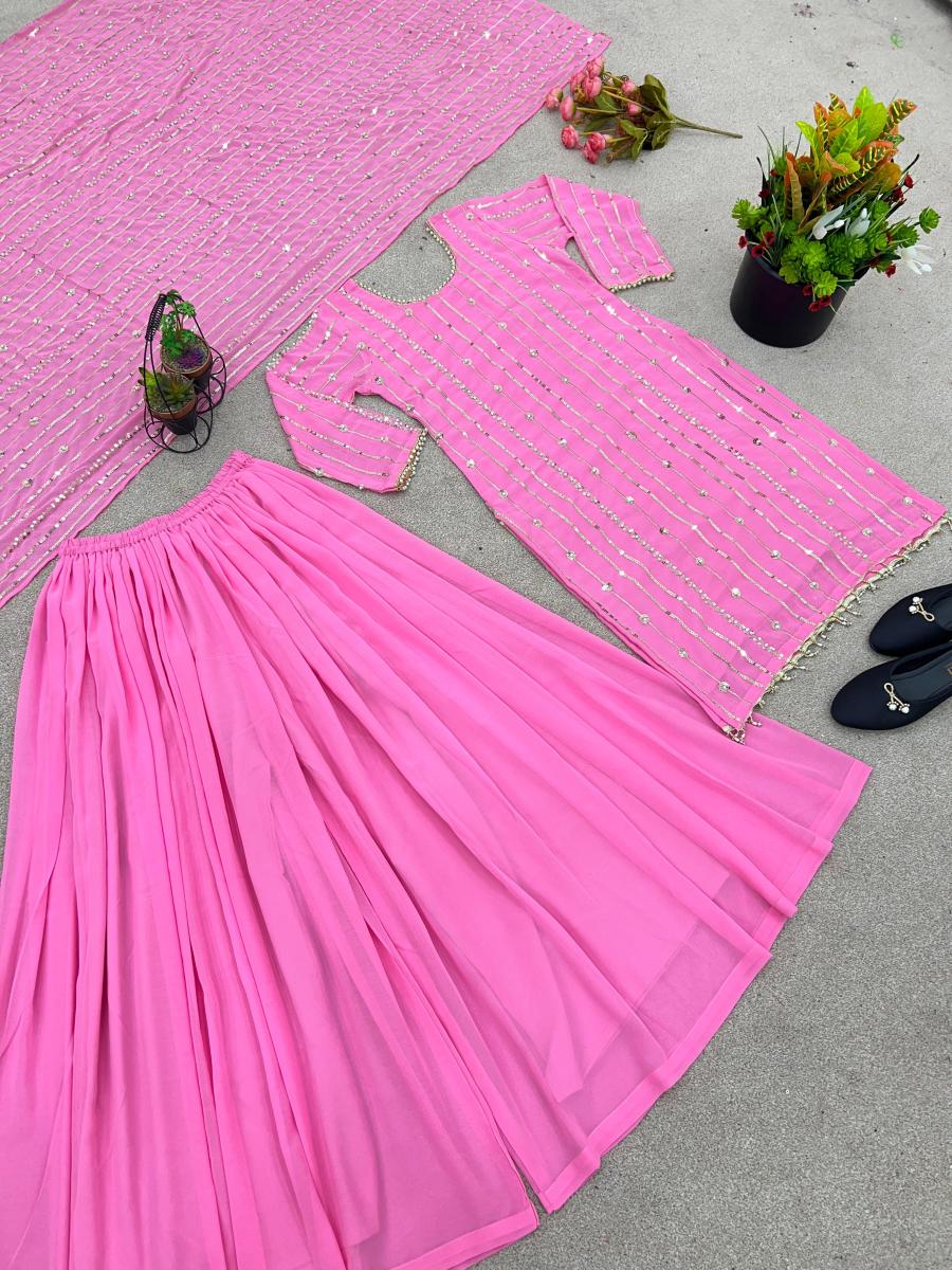 | FABRIC DETAILS | * Top * *Top Fabric * :Heavy Faux Georgette With Heavy Embroidery Sequence Work Full Sleeve *Top Inner * :Heavy Micro Cotton *Top Length * : 37-38 Inch Top Size. : FREE SIZE XL(42) With MARGIN XXL(44) (FULLY STITCHED READY TO WEAR) * Plazo * Plazzo Fabrics :Heavy Faux Georgette Plazzo inner :Heavy Micro Cotton (Full stitched)Plazzo Length:40-41 Inch (fully stitched) * Dupatta* *Dupatta Fabric * :Heavy Faux Georgette With Heavy Embroidery Sequence Work |