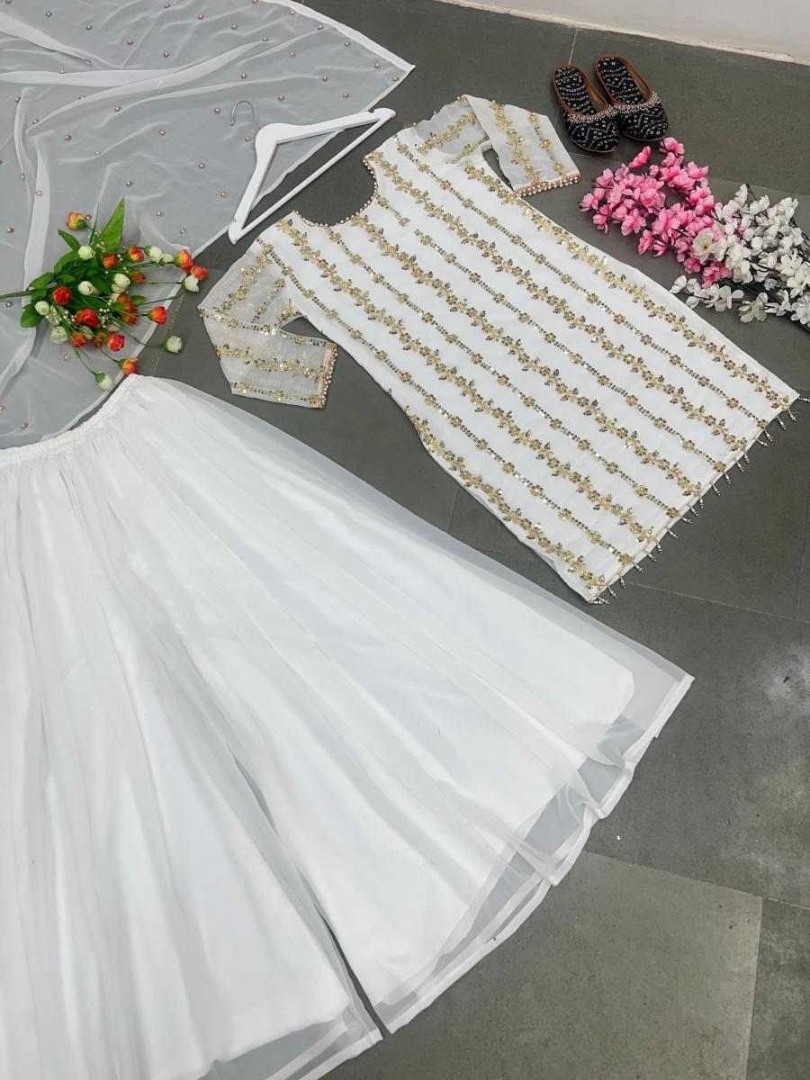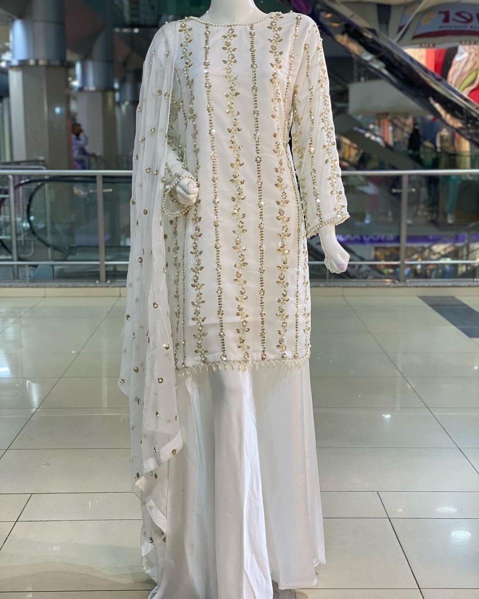 | FABRIC DETAILS | * Top * Top Fabric :Heavy Faux Georgette With Heavy Embroidery Sequence Work And Rivet Moti Work With Full Sleeve (Front Side Work Only)*Top Inner * :Heavy Micro Cotton *Top Length * : 37-38 Inch Top Size. : FREE SIZE XL(42) With MARGIN XXL(44) (FULLY STITCHED READY TO WEAR) Plazzo Plazzo Fabrics :Heavy Faux Georgette Plazzo inner :Heavy Micro Cotton (Full stitched)Plazzo Length:40-41 Inch (fully stitched) Dupatta *Dupatta Fabric * :Heavy Faux Georgette With Heavy Embroidery Sequence Work And Rivet Motif Work |