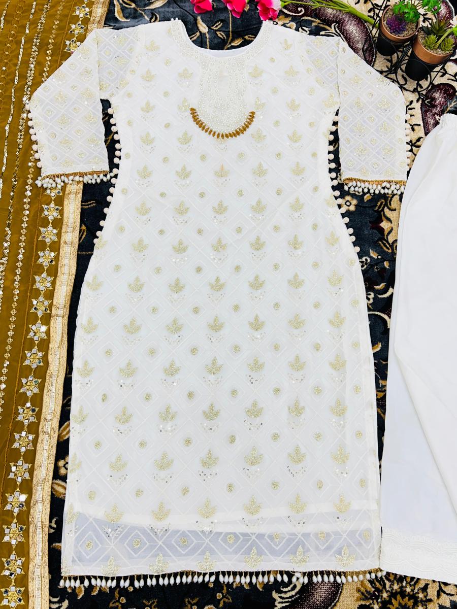 | FABRIC DETAILS | Top Top Fabric :Heavy Faux Georgette With Heavy Embroidery Sequence Work with Rivet Moti Work And Full Sleeve With Latkan Lace BorderTop Inner :Heavy Micro Cotton Top Length : 45-46 Inch Top Size. : M(38),L(40), Xl(42), Xxl(44) (FULLY STITCHED READY TO WEAR) Pent Pent Fabrics :Heavy Faux Georgette With Embroidery Sequence Work Lace Border (Full stitched) Pent Length:40-41 Inch (fully stitched) Dupatta *Dupatta Fabric * :Heavy Faux Georgette With Embroidery Sequence Work And Real Mirror Work |