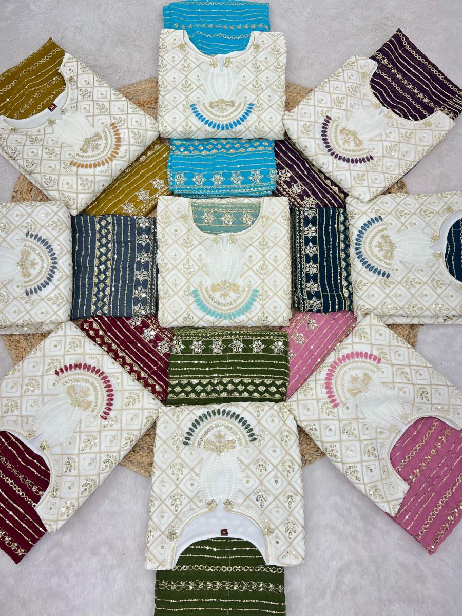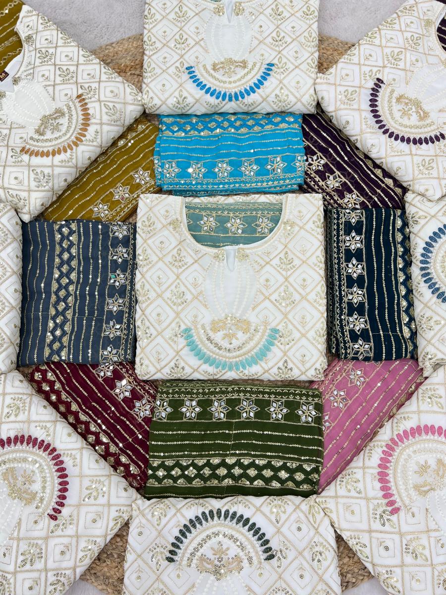 | FABRIC DETAILS | Top Top Fabric :Heavy Faux Georgette With Heavy Embroidery 3mm Sequence Work And Full Sleeve With Latkan Lace BorderTop Inner :Heavy Micro Cotton Top Length : 45-46 Inch Top Size. : M(38),L(40), Xl(42), Xxl(44) (FULLY STITCHED READY TO WEAR) Pent Pent Fabrics :Heavy Faux Georgette With Embroidery Work Lace Border (Full stitched) Pent Length:40-41 Inch (fully stitched) Dupatta *Dupatta Fabric * :Heavy Faux Georgette With Embroidery 3mm Sequence Work And Real Mirror Work |