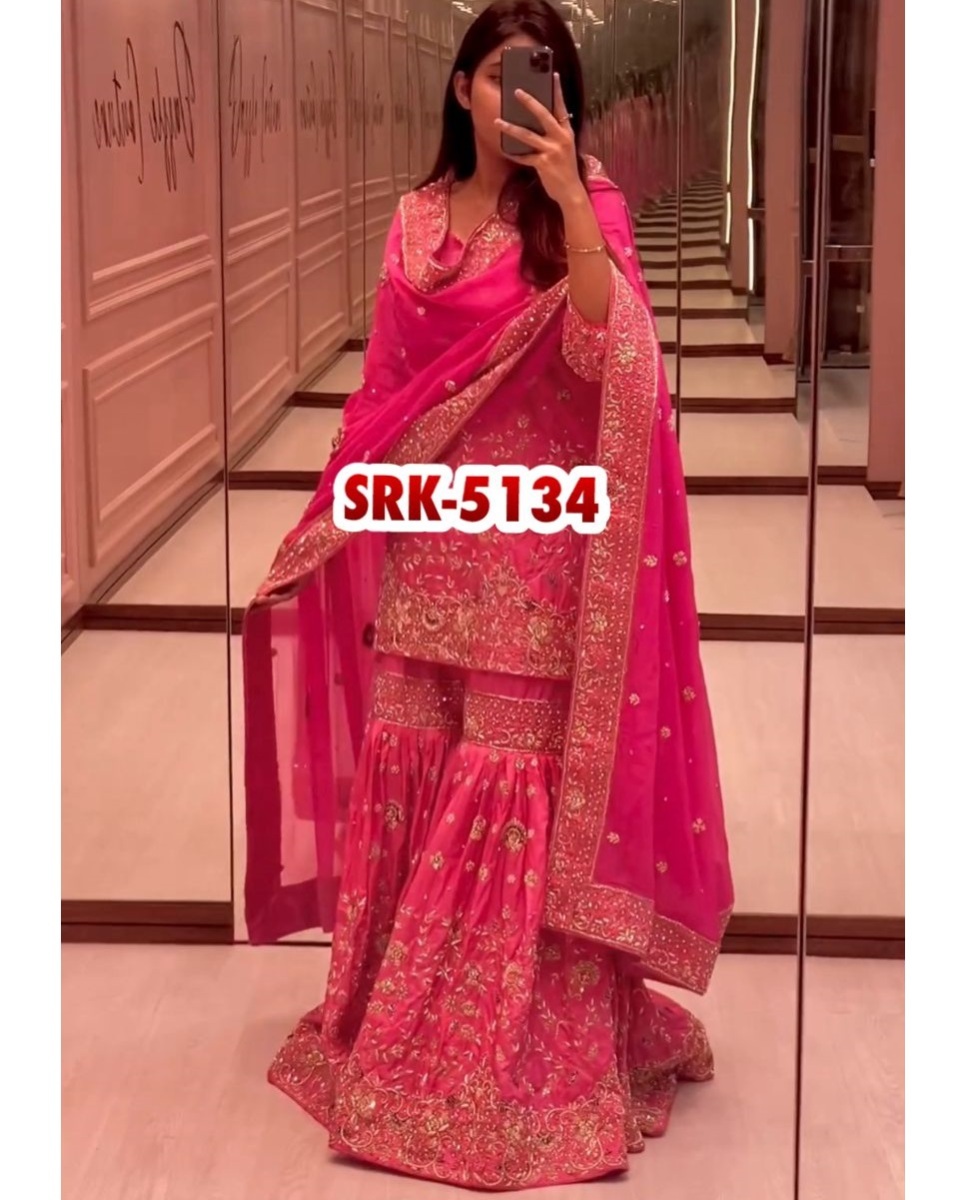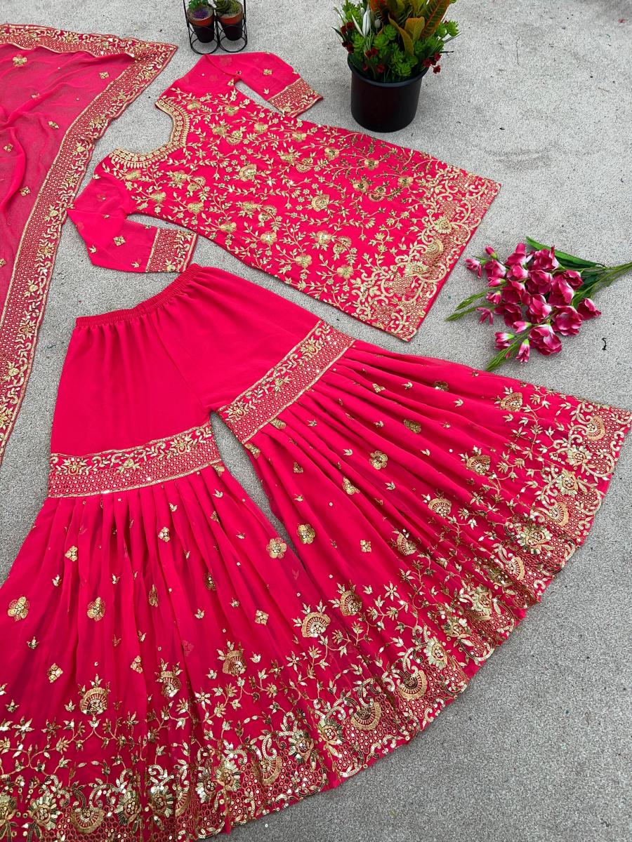 | FABRIC DETAILS | Top Top Fabric :Heavy Faux Georgette With Heavy 5mm Embroidery Sequence Work With Full SleeveTop Inner :Heavy Micro Cotton Top Length :37-38 Inch Top Size. : M(38),L(40),XL(42),XXL(44) (FULLY STITCHED READY TO WEAR) Sharara Plazzo Plazzo Fabrics :Heavy Faux Georgette With 5mm Embroidery Sequence With Fully Flair Plazzo inner :Heavy Micro Cotton Plazzo Length:40-41 Inch (fully stitched) Dupatta Dupatta Fabric :Heavy Faux Georgette With Embroidery Sequence Work And Lace Border Dupatta Length: 2.10MTR |