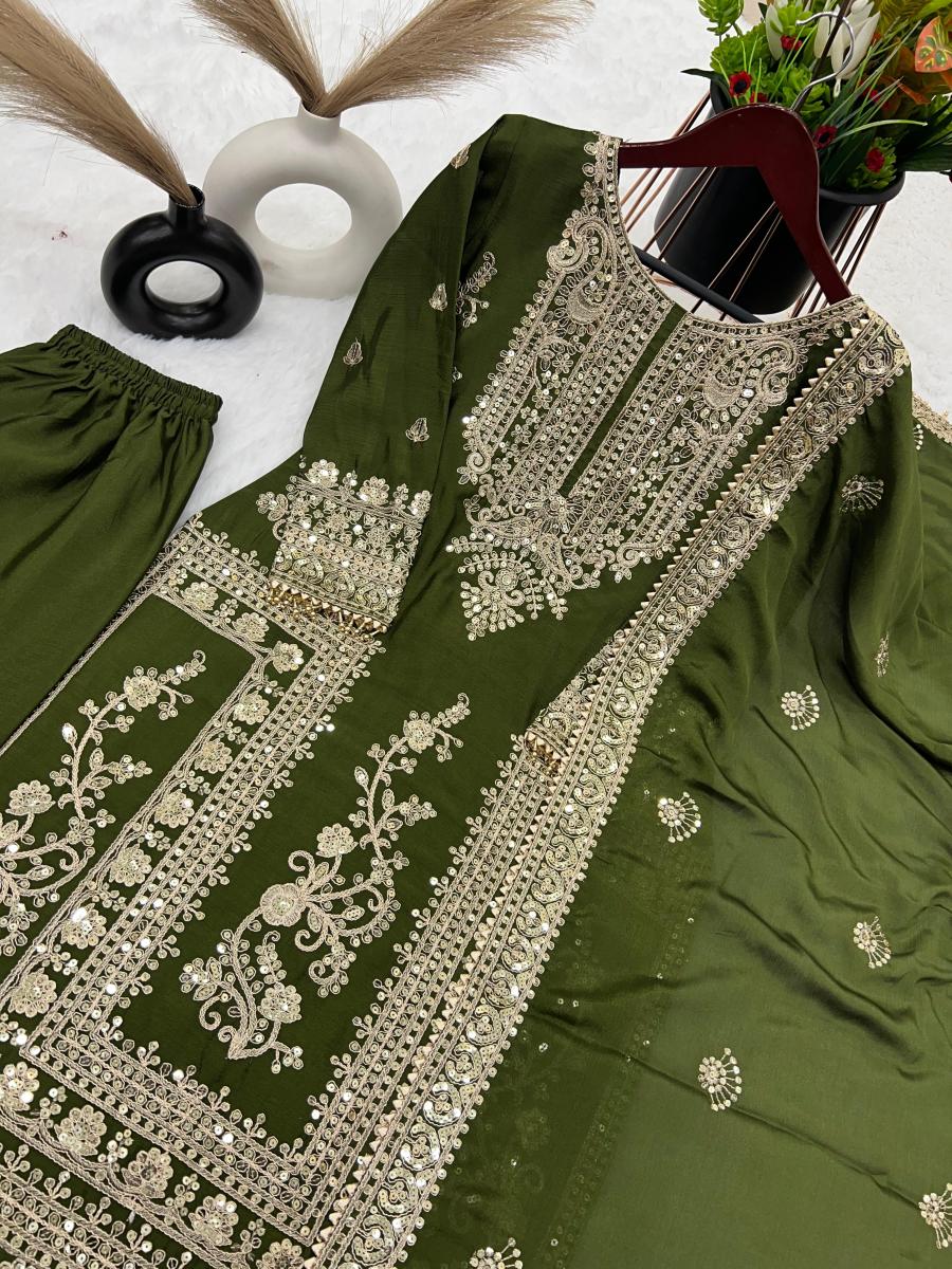 | FABRIC DETAILS | Top Top Fabric :Pure Chinnon Silk With Heavy Embroidery Coding Dori-Sequence Work With Full SleeveTop Inner :Heavy Micro Cotton Top Length : 44-45 Inch Top Size. : M(38),L(40), Xl(42), Xxl(44) (FULLY STITCHED READY TO WEAR) Plazzo Plazzo Fabrics :Pure Chinnon Silk With Heavy Embroidery Coding Dori-Sequence Work With Elastic (Full stitched) Plazzo Length:40-41 Inch (fully stitched) Dupatta Dupatta Fabric :Pure Chinnon Silk With Embroidery Coding Dori-Sequence Work With Lace Border |