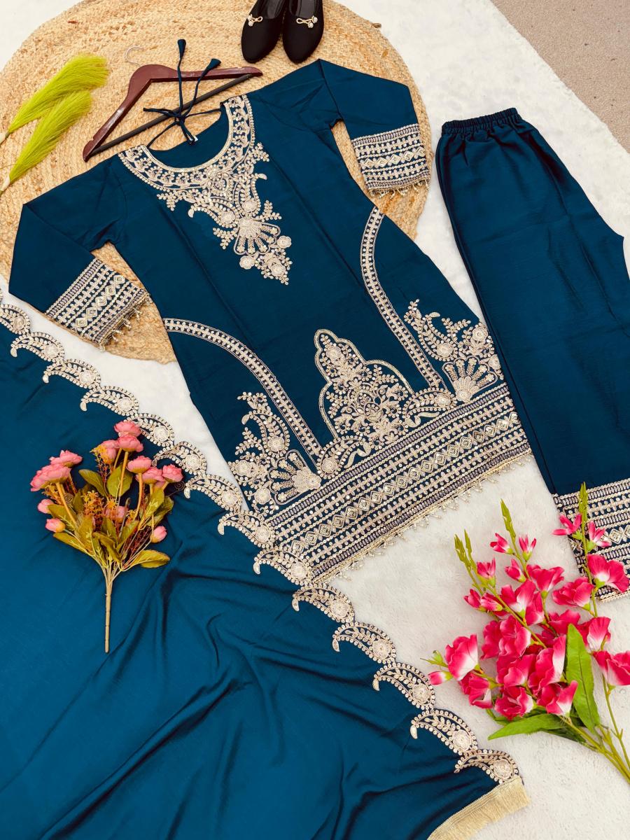 | FABRIC DETAILS | Top Top Fabric :Pure Chinnon Silk With Heavy Embroidery Coding Dori-Sequence Work With Full SleeveTop Inner :Heavy Micro Cotton Top Length:-39-40Inch Top Size. : M(38) AND Xl(42) (FULLY STITCHED READY TO WEAR) Bottom Bottom Fabrics :Pure Chinnon Silk With Heavy Embroidery Coding Dori-Sequence Work With Elastic (Full stitched) Bottom Length:40-41 Inch (fully stitched) Dupatta Dupatta Fabric :Pure Chinnon Silk With Embroidery Coding Dori-Sequence With Lace Border |