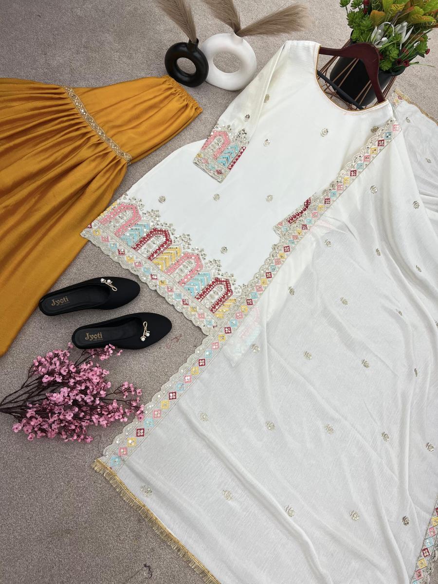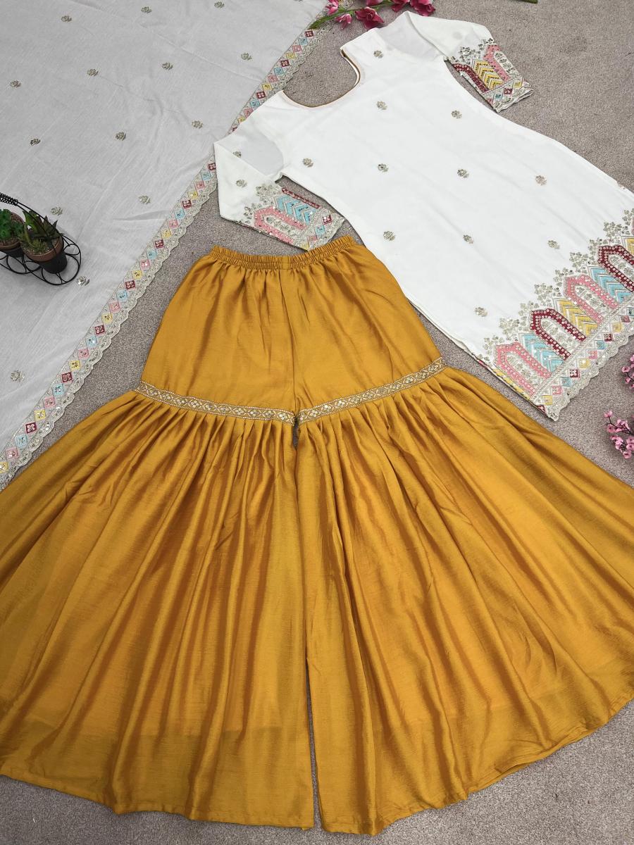 | FABRIC DETAILS | Top Top Fabric :Pure Chinnon Silk With Heavy Embroidery Sequence Work And Full SleeveTop Inner :Heavy Micro Cotton Top Length : 39-40 Inch Top Size. : M(38),L(40), Xl(42), Xxl(44) (FULLY STITCHED READY TO WEAR) Gharara Gharara Fabrics :Pure Chinnon Silk With Embroidery Sequence Work With Elastic (Full stitched) Gharara Length:40-41 Inch (fully stitched) Dupatta *Dupatta Fabric * :Pure Chinnon Silk With Embroidery Sequence Work With Lace Border |