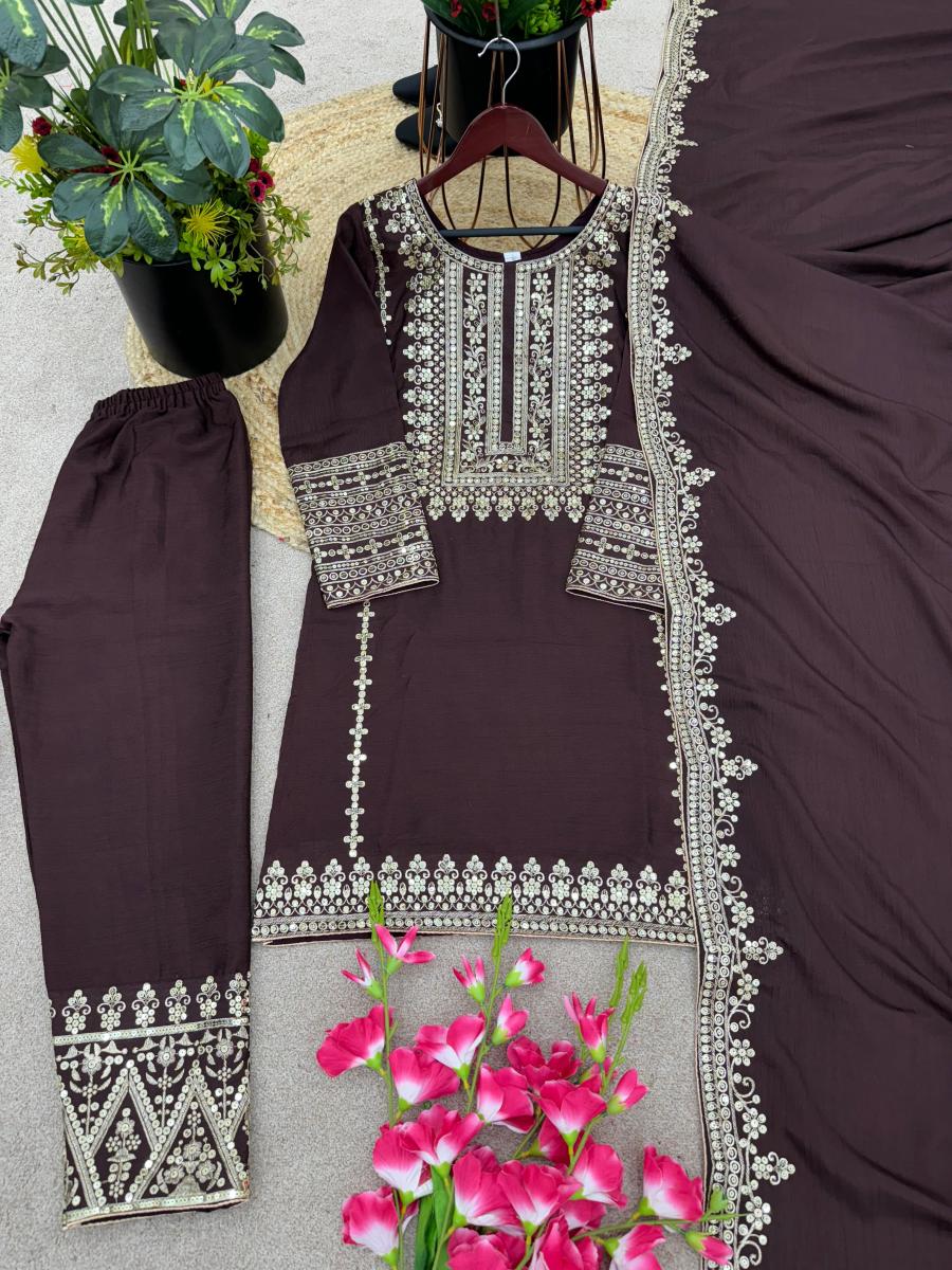 | FABRIC DETAILS | Top Top Fabric :Pure Chinnon Silk With Heavy Embroidery Sequence Work With Full SleeveTop Inner :Heavy Micro Cotton Top Length:-39-40Inch Top Size. : M(38) AND XL(42) (FULLY STITCHED READY TO WEAR) Bottom Bottom Fabrics :Pure Chinnon Silk With Heavy Embroidery Sequence Work With Elastic (Full stitched) Bottom Length:40-41 Inch (fully stitched) Dupatta Dupatta Fabric :Pure Chinnon Silk With Embroidery Sequence With Lace Border |