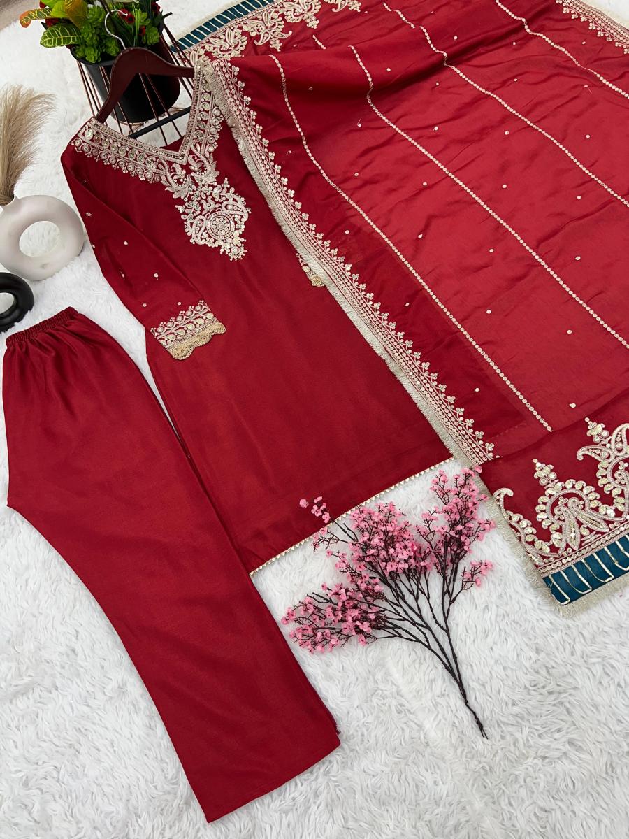 | FABRIC DETAILS | Top Top Fabric :Pure Chinnon Silk With Heavy Embroidery Sequence Work With Full SleeveTop Inner :Heavy Micro CottonTop Size. : M(38),L(40), Xl(42), Xxl(44) (FULLY STITCHED READY TO WEAR) Bottom Bottom Fabrics :Pure Chinnon Silk With Elastic (Full stitched) Bottom Length:40-41 Inch (fully stitched) Dupatta Dupatta Fabric :Pure Chinnon Silk With Embroidery Sequence Work With Lace Border |