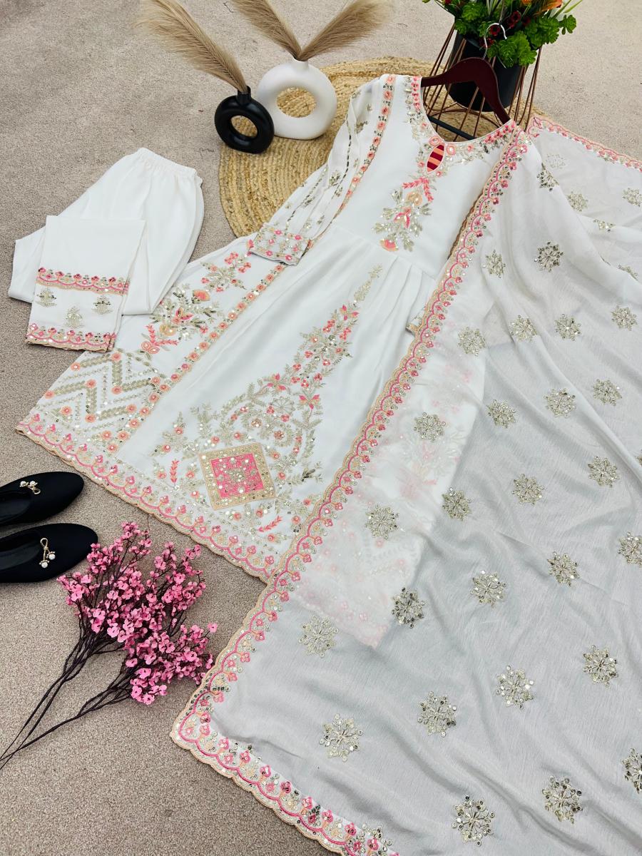 | FABRIC DETAILS | Top Top Fabric :Pure Chinnon Silk With Heavy Embroidery Sequence Work With Fancy Full Sleeve Top Inner :Heavy Micro Cotton Top Length:-46-47Inch Top Size: M(38),L(40),Xl(42),XXL(44) (FULLY STITCHED READY TO WEAR) Bottom Bottom Fabrics :Pure Chinnon Silk With Heavy Embroidery-Sequence Work With Elastic Bottam Inner :Heavy Micro Cotton (Full stitched) Bottom Length:40-41 Inch Dupatta Dupatta Fabric :Pure Chinnon Silk With Embroidery Sequence Work With Lace Border |