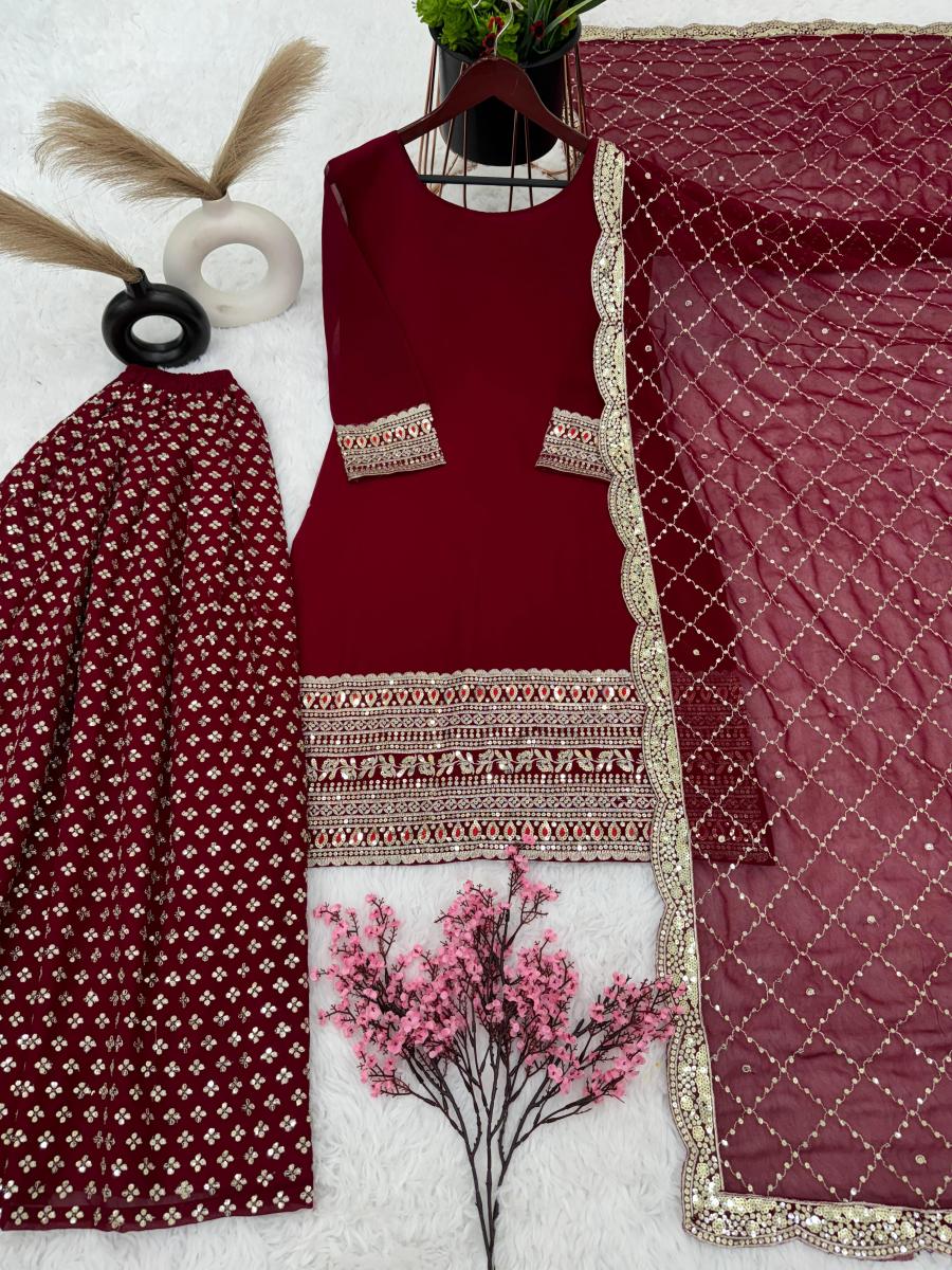 | FABRIC DETAILS | Top Top Fabric :Heavy Faux Georgette With 5mm Embroidery Sequence Work With Full Sleeve Top Inner :Heavy Micro Cotton Top Length :37-38 Inch Top Size. : M(38),L(40),XL(42),XXL(44) (FULLY STITCHED READY TO WEAR) Sharara Plazzo Plazzo Fabrics :Heavy Faux Georgette With 5mm Embroidery Sequence With Fully Flair Plazzo inner :Heavy Micro Cotton Plazzo Length:40-41 Inch (fully stitched) Dupatta Dupatta Fabric :Heavy Faux Georgette With Embroidery Sequence Work And Lace Border Dupatta Length: 2.10MTR |