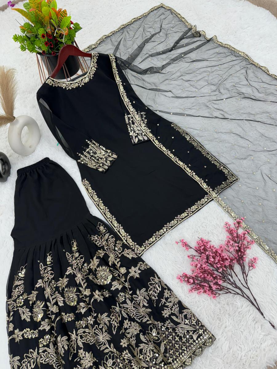| FABRIC DETAILS | Top Top Fabric :Heavy Faux Georgette With 5mm Embroidery Sequence Work With Full SleeveTop Inner :Heavy Micro Cotton Top Length :38-39 Inch Top Size. : M(38),L(40),XL(42),XXL(44) (FULLY STITCHED READY TO WEAR) Sharara Plazzo Plazzo Fabrics :Heavy Faux Georgette With 5mm Embroidery Sequence With Fully Flair Plazzo inner :Heavy Micro Cotton Plazzo Length:40-41 Inch (fully stitched) Dupatta Dupatta Fabric :Soft Net With Embroidery Sequence Work And Lace Border Dupatta Length: 2.10MTR |