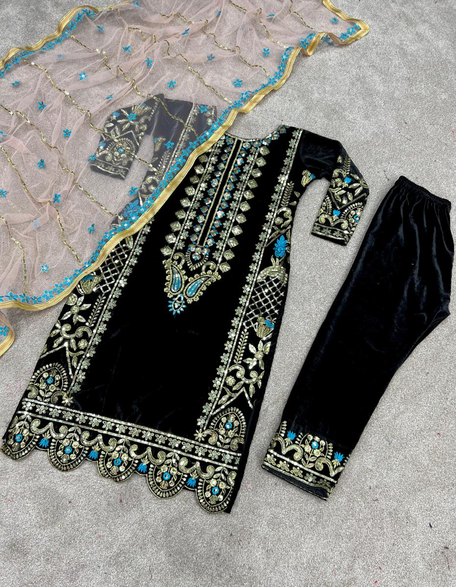 | FABRIC DETAILS | Top Fabric :Heavy Viscose Velvet With Heavy Embroidery sequence Work With SleevesTop Inner : Micro Cotton Top Size : M(38),L(40),XL(42), XXL(44) (Fully Stitched Completely Ready To Wear) Top Length : 39-40 InchesBottom Fabric : Viscose Velvet with Embroidery sequence work( *Full Stiched l)Dupatta Fabric : Heavy Net With Embroidery Sequence Work With lace border |