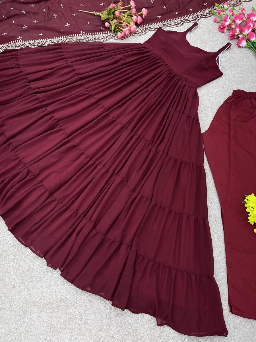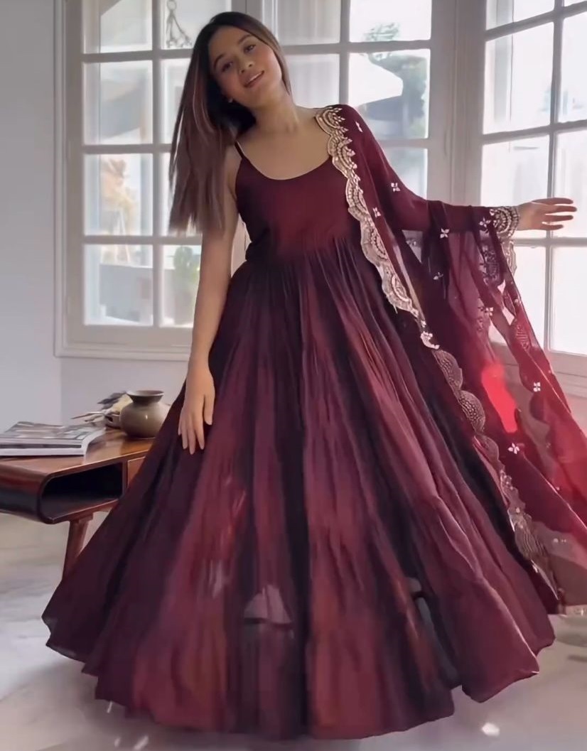 | FABRIC DETAILS | Top Fabric:Heavy Georgette With attached Pad With Extra Sleeve Fabric and Fully 10 Meter Ruffle Flair Gown Length:54-55 inches Gown Inner: Micro Cotton Gown Flair * :- *10 MeterBottom: Micro Cotton (Full Stiched)Dupatta Fabric: Heavy Georgette Embroidery Sequence WorkSIZE XL(42)AND XXL(44)Margin Fully stitched completely ready to wear |