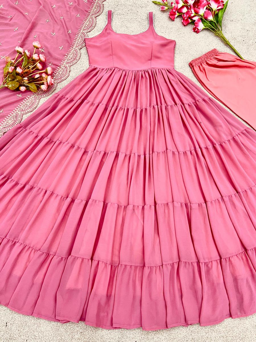| FABRIC DETAILS | Top Fabric:Heavy Georgette With attached Pad With Extra Sleeve Fabric and Fully 10 Meter Ruffle Flair Gown Length:54-55 inches Gown Inner: Micro Cotton Gown Flair * :- *10 MeterBottom: Micro Cotton (Full Stiched)Dupatta Fabric: Heavy Georgette Embroidery Sequence WorkSIZE XL(42)AND XXL(44)Margin Fully stitched completely ready to wear |