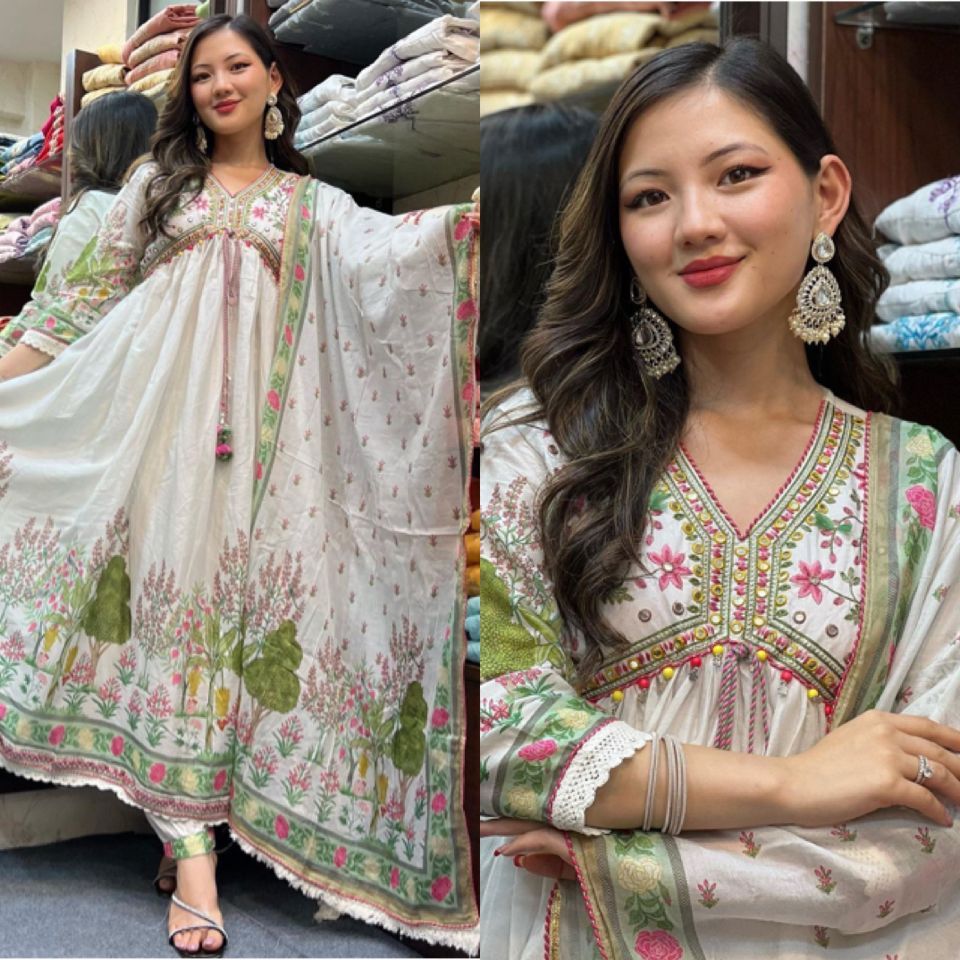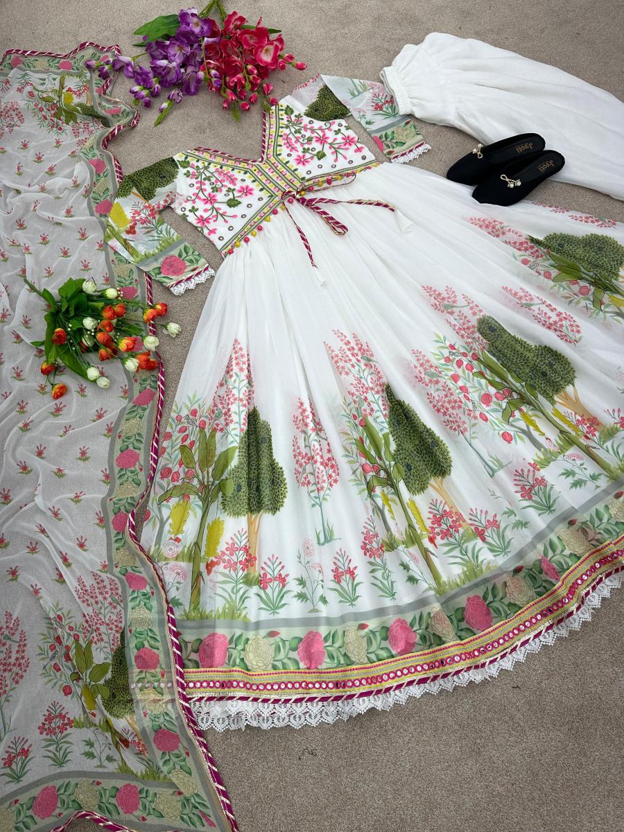 | FABRIC DETAILS | Gown Fabric :Faux Georgette With Heavy Embroidery Work With Digital Print and Real Mirror Handwork Full SleeveGown Inner : Micro Cotton Gown Size : Up To 42 XL Free Size (Fully Stitched) Gown Length * : 50-51 Inches Gown Flair * : 3 MeterPatiala Salwar Fabric and Work * : Faux Georgette With Digital Print and Micro Cotton Inner ( *Full Stiched *)Dupatta Fabric : Heavy Faux Georgette With Digital Print Work With Heavy Lace Borde |