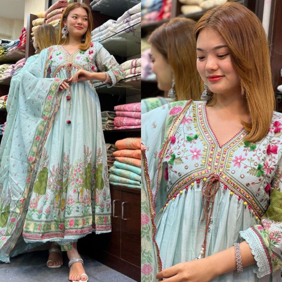 | FABRIC DETAILS | Gown Fabric :Faux Georgette With Heavy Embroidery Work With Digital Print and Real Mirror Handwork Full SleeveGown Inner : Micro Cotton Gown Size : Up To 42 XL Free Size (Fully Stitched) Gown Length * : 50-51 Inches Gown Flair * : 3 MeterPatiala Salwar Fabric and Work * : Faux Georgette With Digital Print and Micro Cotton Inner ( *Full Stiched *)Dupatta Fabric : Heavy Faux Georgette With Digital Print Work With Heavy Lace Borde |