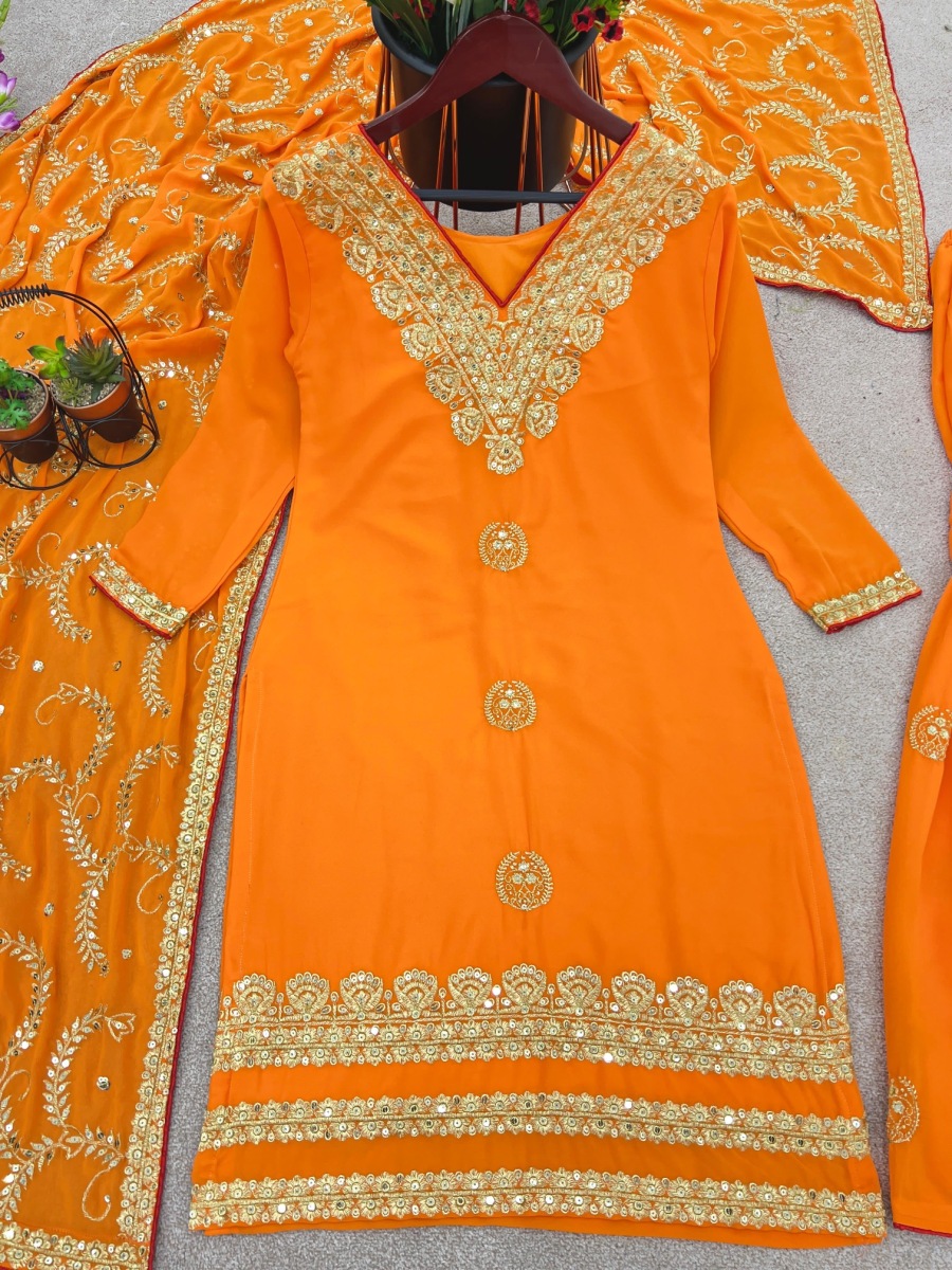 | FABRIC DETAILS | Fabric Detail**Top* *Top Fabric * :Heavy Faux Georgette With *Embroidery Sequence Work with Sleeve* *Top Inner* :Heavy Micro Cotton *Top Length* : 36-38 *Top Size*. : *M(38),L(40),XL(42),XXL(44)* *(Fully Stitched Complete Ready To Wear)*Sharara* *Sharara Fabrics* :Heavy Faux Georgette With Embroidery Sequence Work *Sharara Length*:40-41 Inch *(fully stitched)**Dupatta* *Dupatta Fabric * :Heavy Faux Georgette With *Heavy Embroidery Sequence Work With Moti Lace Border* |