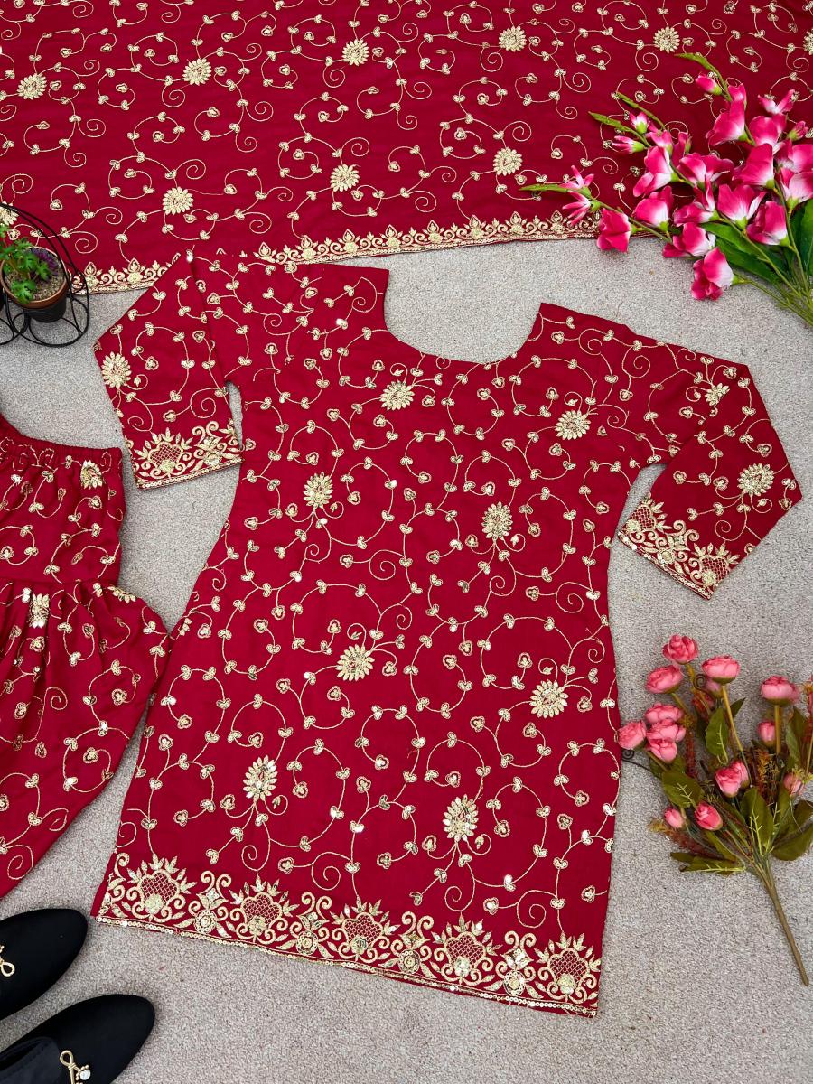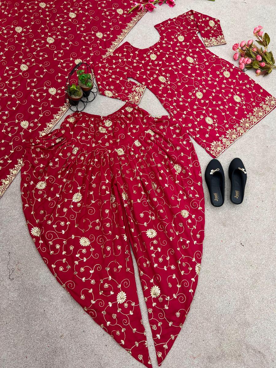 | FABRIC DETAILS | Top Fabric * :Heavy Vichitra Silk Heavy *Embroidery 5mm Sequence Work With SleeveToo Inner : Micro Cotton Too Size : Up To 42 Xl Free Size (Fully Stiched) Top Length : 33-34 InchesDhoti Salwar :Heavy Vichitra Silk With Embroidery 5 mm Sequence Work (Fully Stiched Dhoti Styles Xl size and Length is 43-44) Dhoti Inner :Micro CottonDupatta Fabric :Heavy Vichitra Silk With Embroidery 5 mm Sequence Work Dupatta Length: 2.10mtr Package Contain :- Top, Dhoti Salwar and Dupatta |