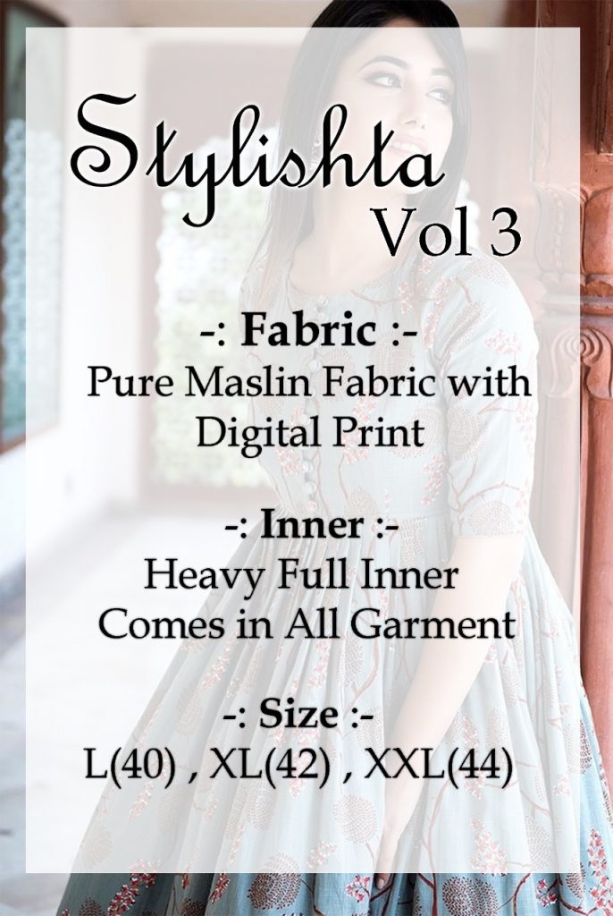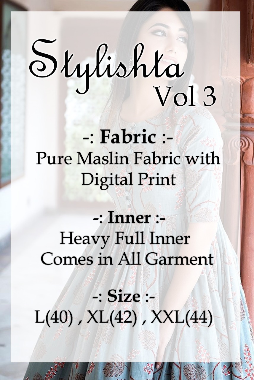 | DETAILS | Gown :- Maslin Fabric Work :- Digital Printed Inner :- Full inner In all Designs Length :- Max up to 55 Size :- L, XL,XXL Type :- stitched |